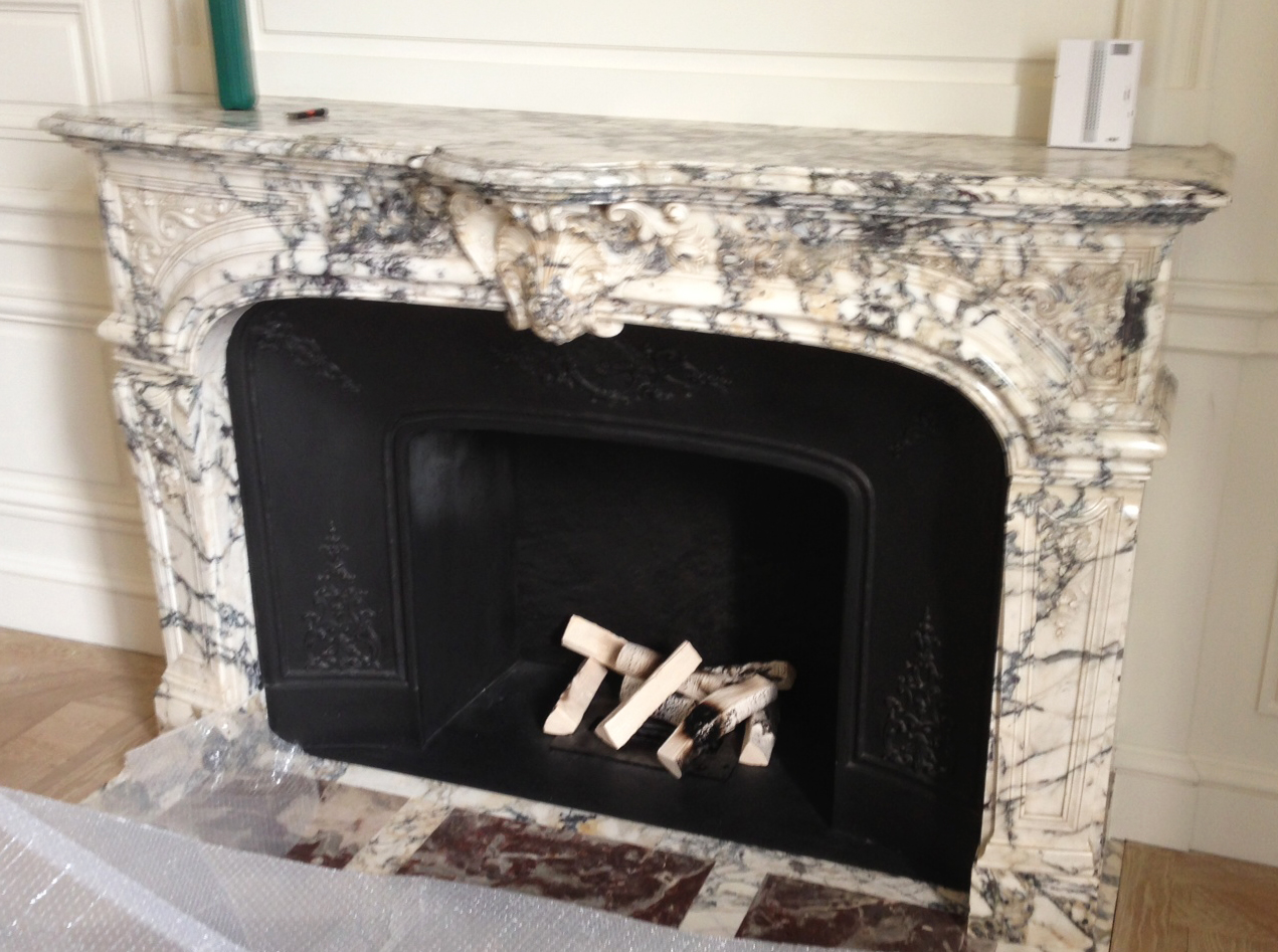 Pose d’une cheminée de style Louis XV en marbre noir