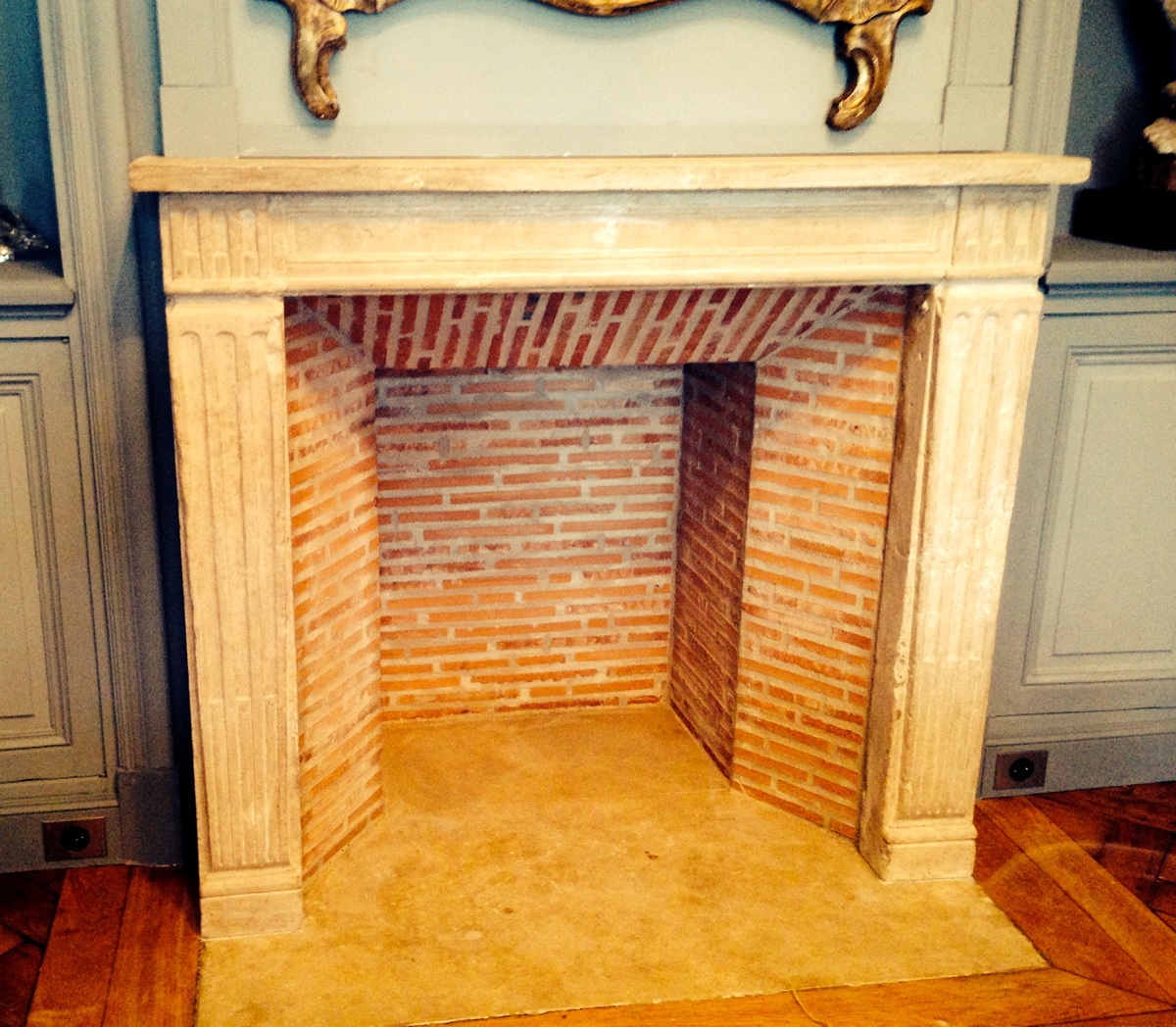 Ainsi, pour cette cheminée d’époque Louis XVI, j’ai fabriqué un intérieur complet en briquettes réfractaires posées sur chant et en quinconce.