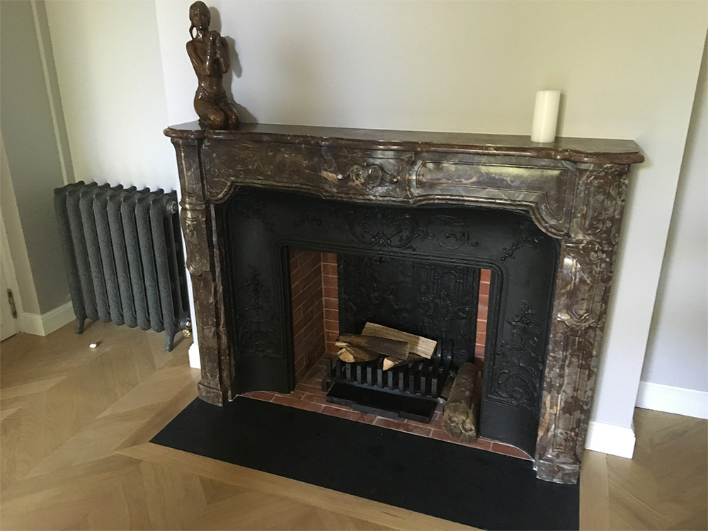 Cette cheminée en marbre Rouge du Nord est pourvue d’un intérieur en fonte et d’une dalle foyère fabriquée pour l’occasion dans un marbre noir contrastant de manière sympathique avec la cheminée.
