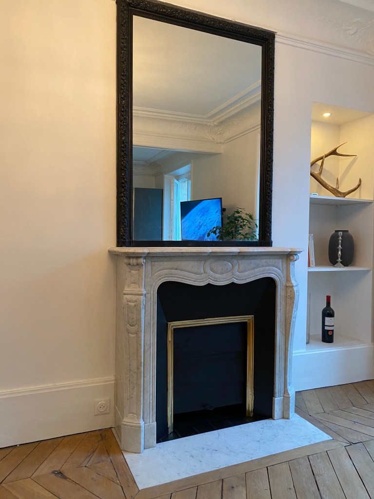 Cette cheminée donc, a été fabriquée dans un marbre blanc carrare. J’ai fait fabriquer un rétrécis en acier noir avec un rideau ancien. De plus l’âtre est en acier fabriqué sur mesure et posé sur une plaque en marbre uni, donnant un accent résolument actuel à cette cheminée qui connaît ainsi une seconde vie.