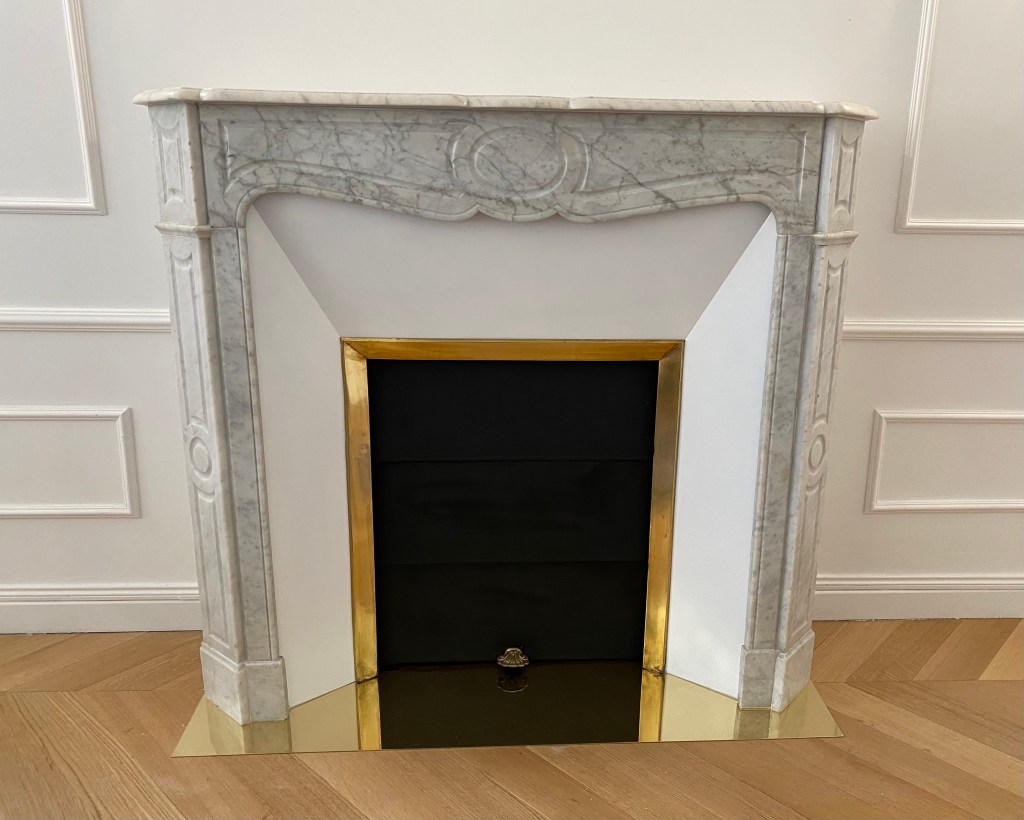 Nous avons ici une petite cheminée Pompadour, le modèle de cheminée le plus répandu dans le Paris Haussmannien. En marbre, ces cheminées étaient, au XIXè siècle, habillées d’un rétrécissement en faïence blanc avec le rideau métallique à trois pans.