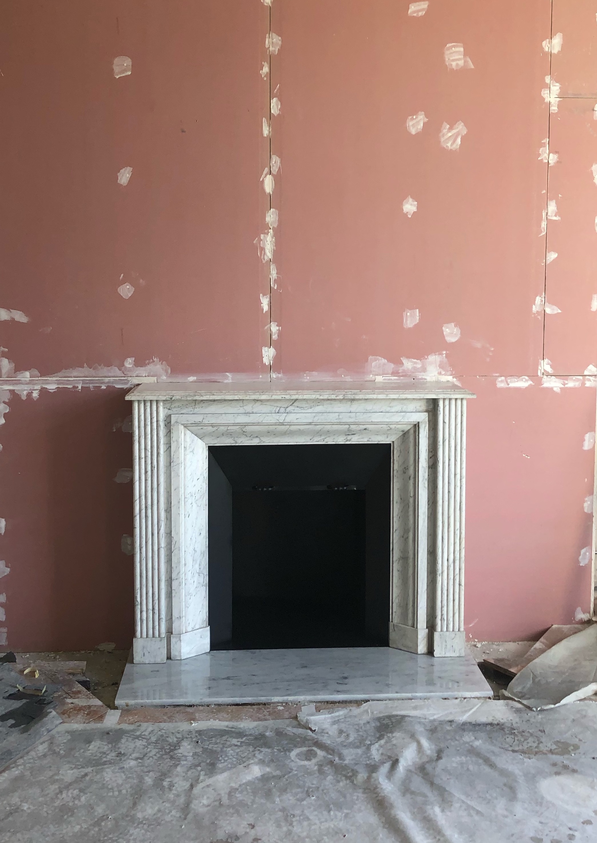La cheminée que je vous présente est de type « Art Déco » en marbre blanc carrare. J’ai réalisé un rétrécit ainsi qu’un foyer en acier noir sur mesure, muni d’un rideau. Le sol est également protégé par une dalle de marbre blanc carrare comme celui de la cheminée.