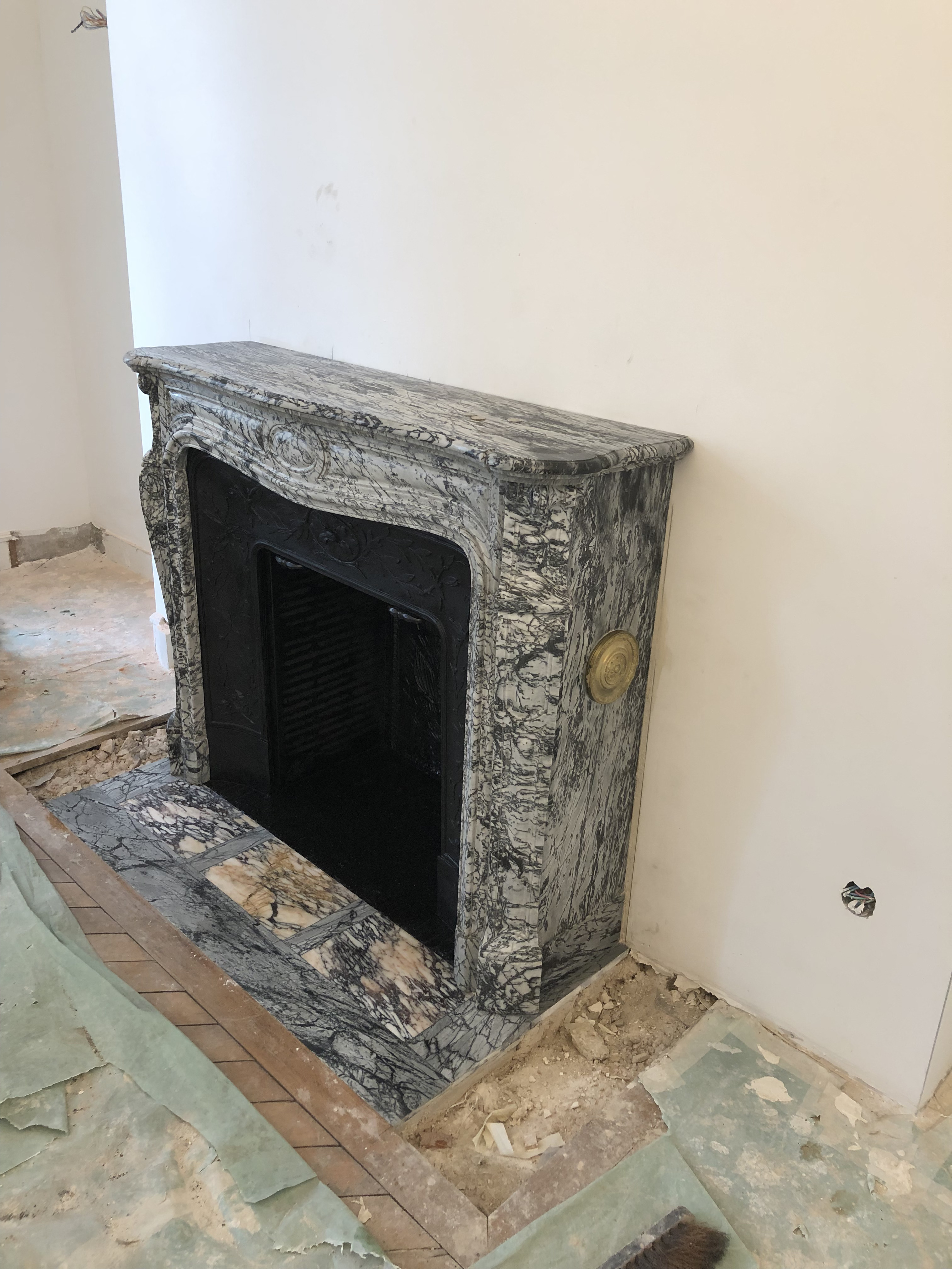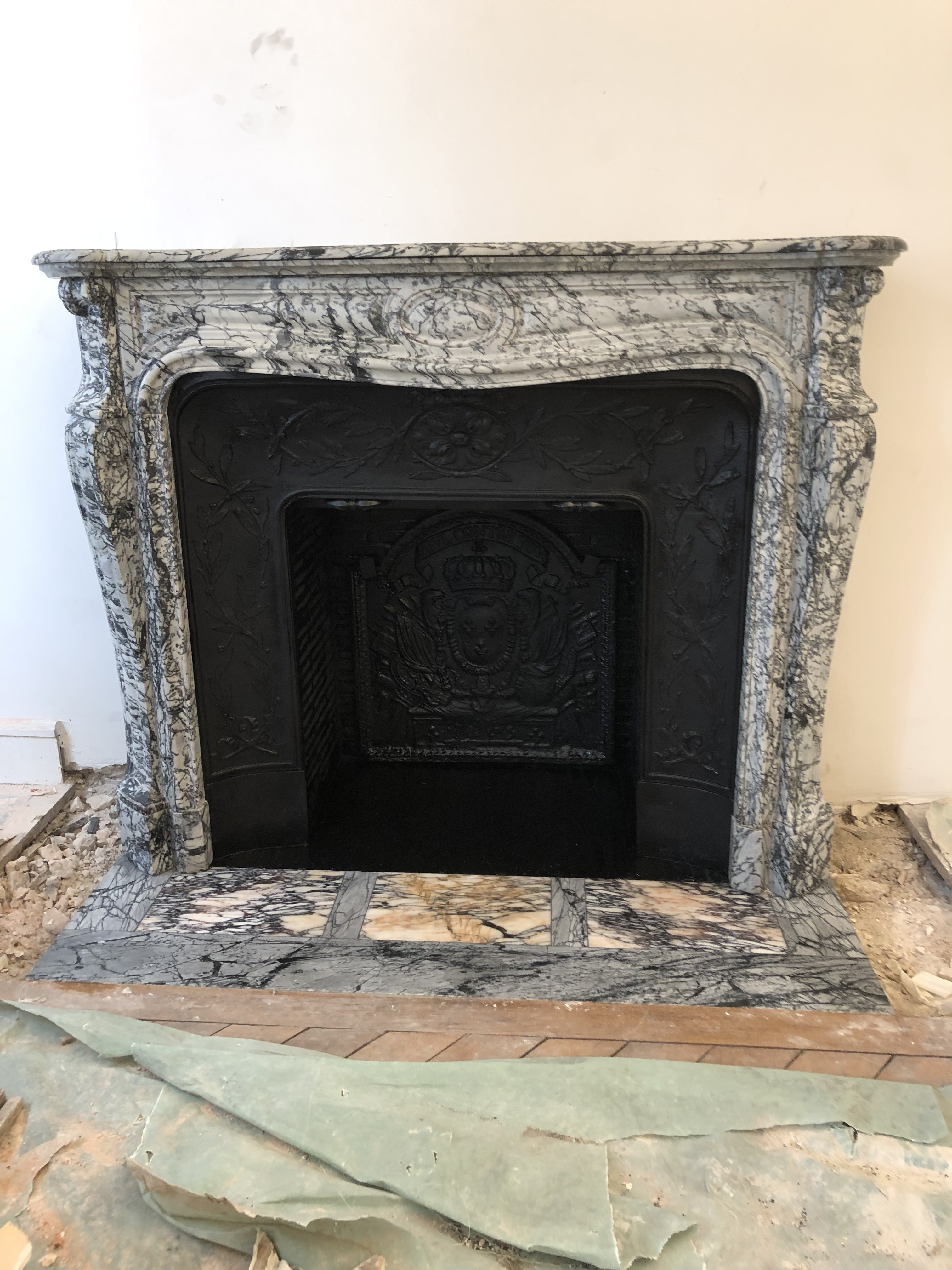 Cette cheminée haussmannienne de la fin du XIXè siècle est un modèle appelé « Pompadour pied galbé » réalisé dans un marbre bleu veiné qui se nomme « Bleu Fleuri ».
