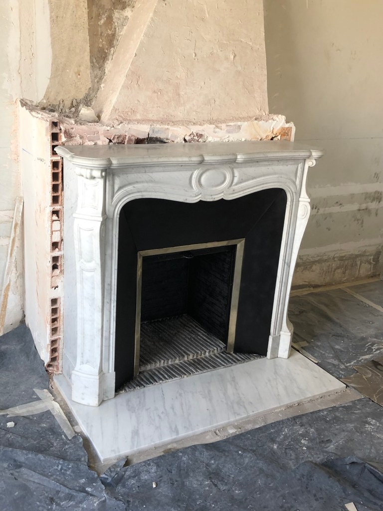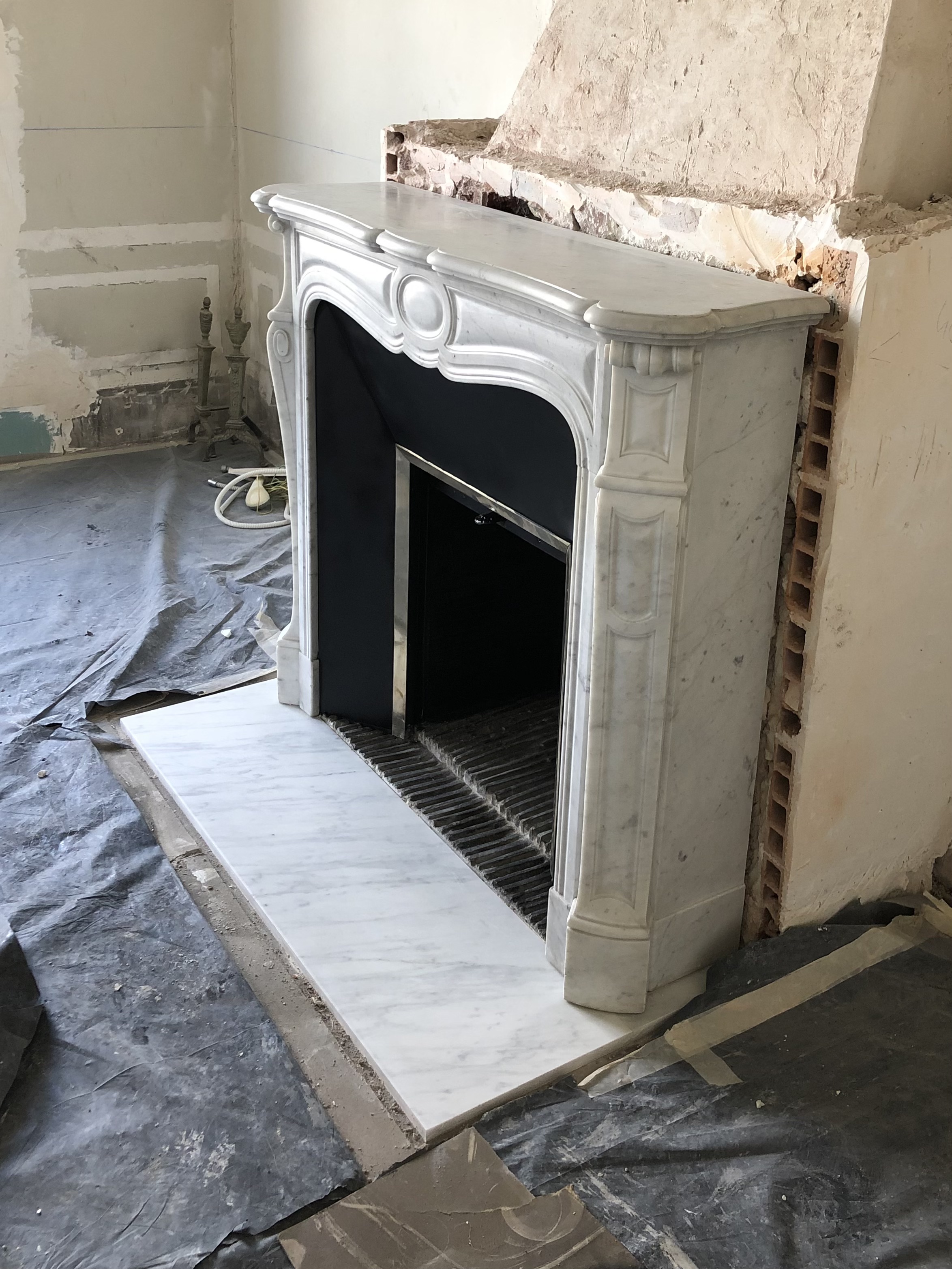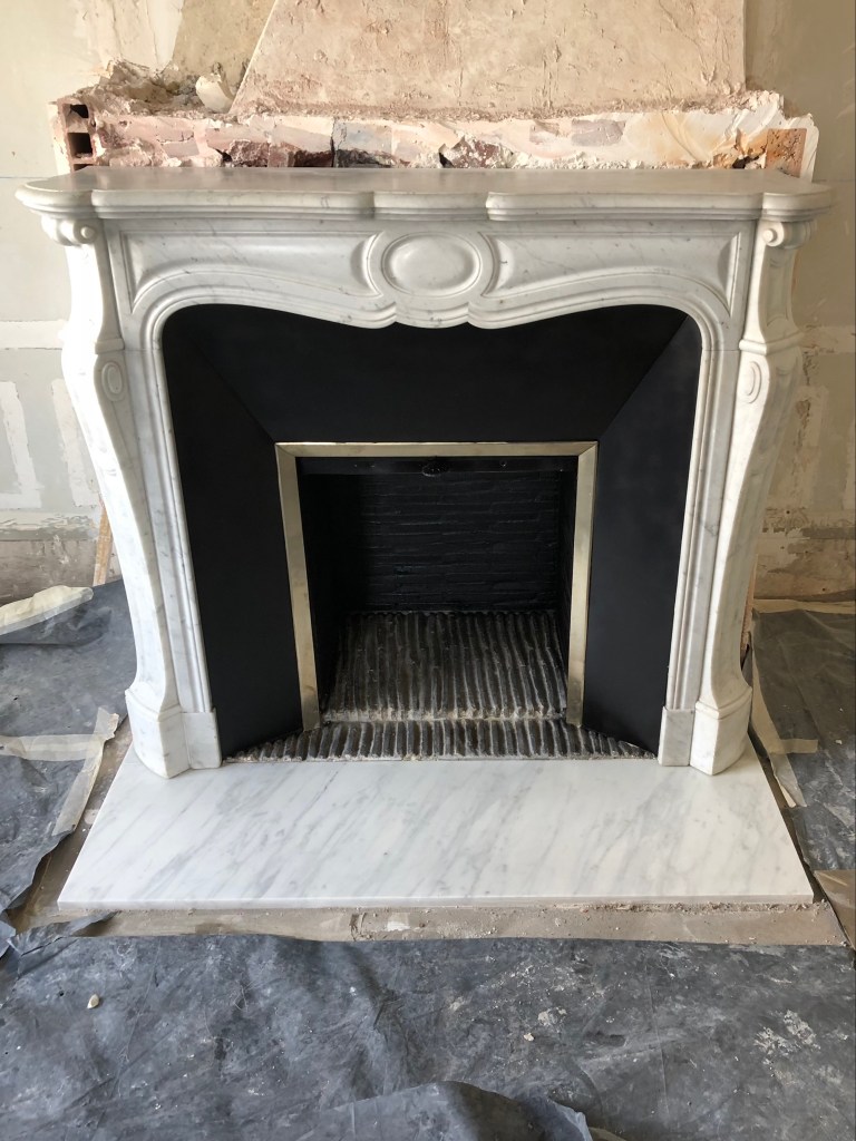 J’ai installé cette cheminée dite « Pompadour » il y a quelques jours. Ancienne, cette cheminée est du XIXè siècle. Ce qui est intéressant et très décoratif ici, c’est se rétrécit noir qui tranche avec le marbre blanc de la cheminée et confère une grande modernité à l’ensemble. Le foyer est comme à l’habitude fermé par un rideau et s’ouvre sur un âtre en briquettes réfractaires.