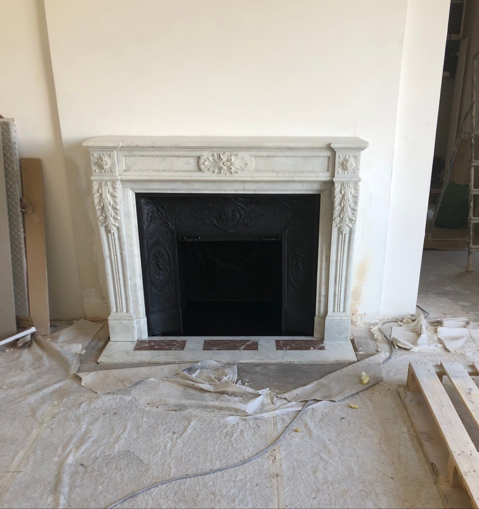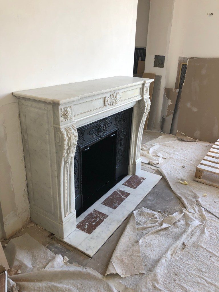 Pur cette cheminée, mes clients souhaitaient un intérieur en acier noir avec une plaque en fonte décorative au fond du foyer. Le sol quant à lui est une dalle foyère de marbre blanc à trois carrés de marbre rouge d’origine.