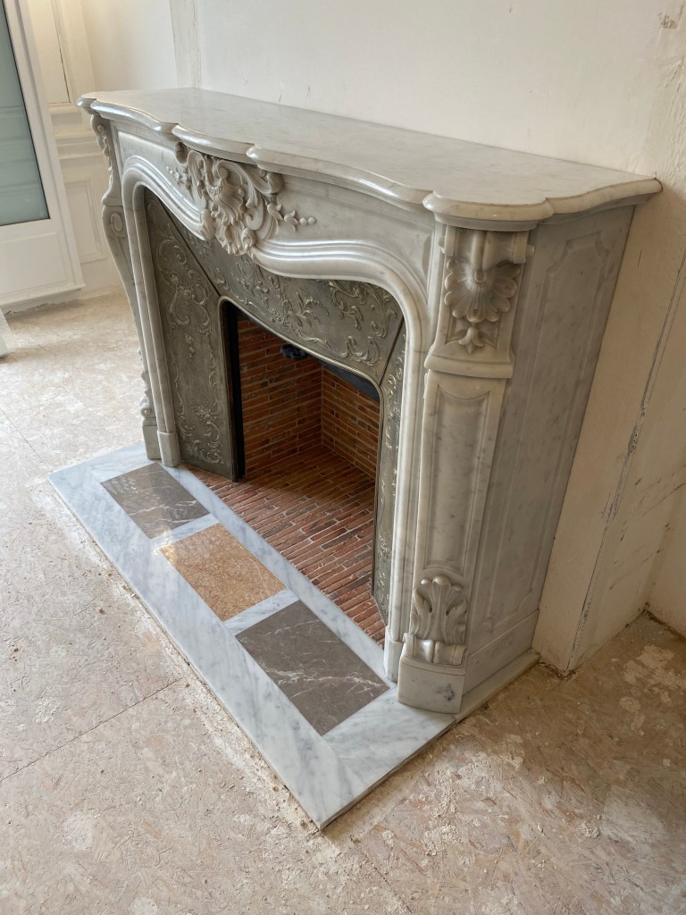 Voici une cheminée au décor majestueux, assemblée sur ça dalle foyère d’origine. Le style Louis XV se prêtant tout particulièrement aux belles sculptures avec ses coquilles et feuillages.