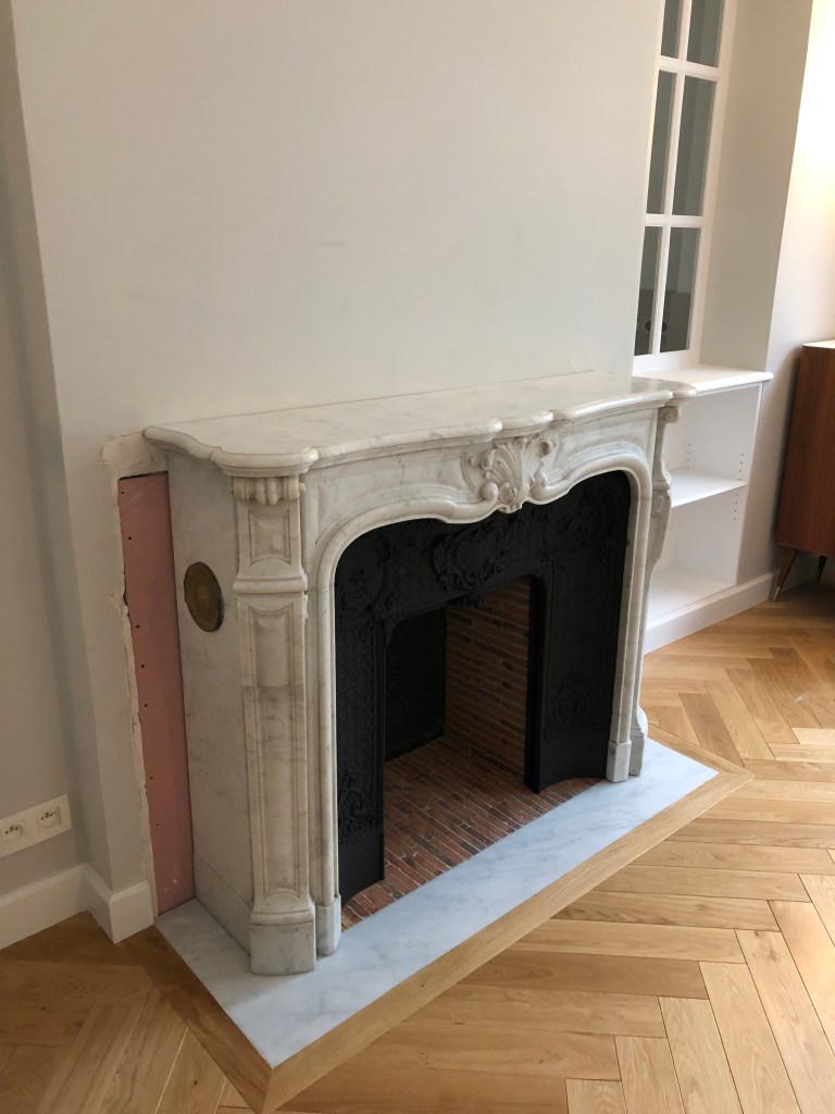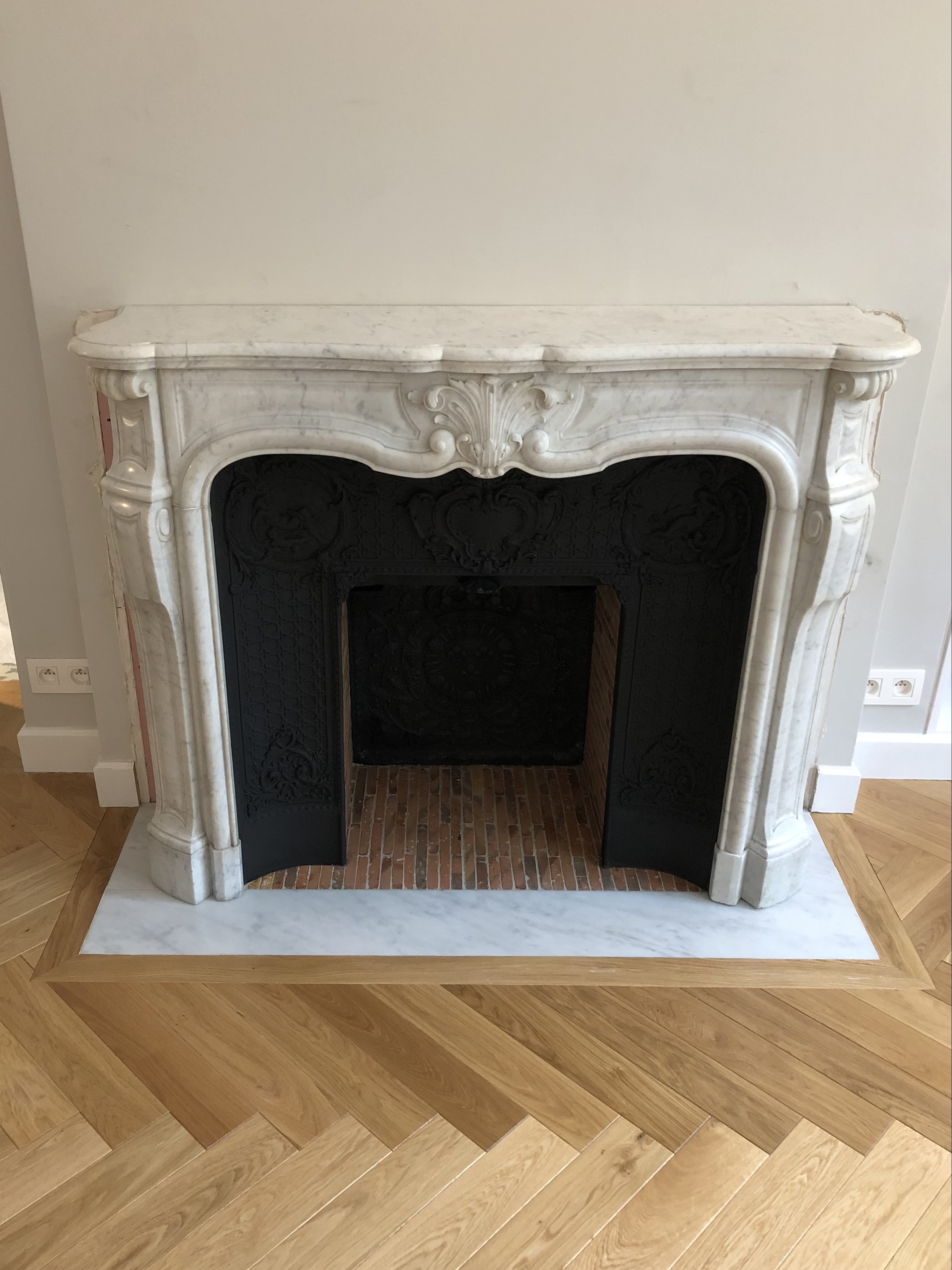 C’est une belle cheminée charnue et sculptée, de style Louis XV, que j’ai pu installer il y a quelques jours dans une maison en région parisienne. Faite dans un marbre blanc de Carrare, la cheminée comporte son intérieur en fonte décoré que j’ai également posé et couplé avec un foyer de briquettes réfractaires. Pour finir, une plaque en fonte décorée a été ajoutée au fond du foyer.