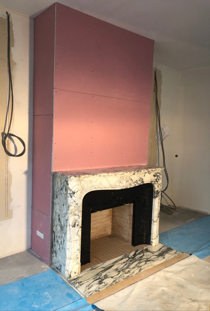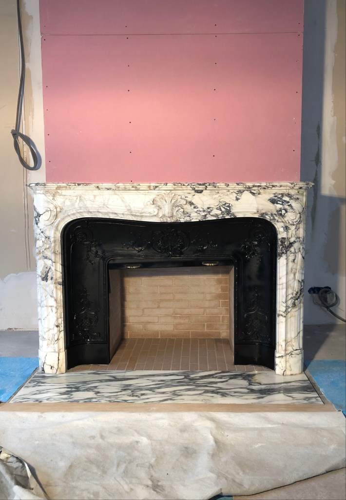 Cette cheminée prestigieuse a été installée dans un très bel appartement de Paris. De style Régence, cette cheminée fait un peu plus de 1.65 mètre de large et chaque élément de la composante pèse très lourd !