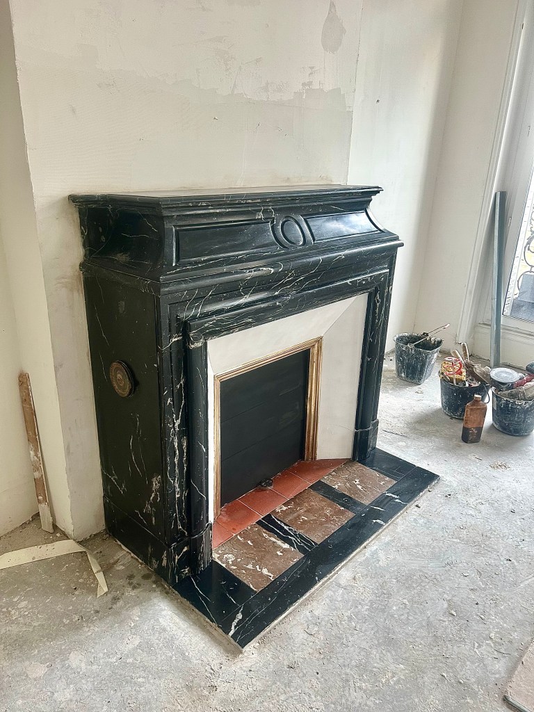 J’ai installé cette belle cheminée il y a quelques jours en région parisienne. Datant du XIXè siècle, cette cheminée de style Louis XIV est en marbre noir Marquina, un marbre d’une couleur noire complètement uniforme avec veines. J’ai fixé le rétrécissement de cette cheminée en émail blanc avec son rideau comme il était d’usage au XIXè siècle. J’ai également réalisé l’âtre en briquettes réfractaires afin d’avoir une parfaite résistance au feu de bois.