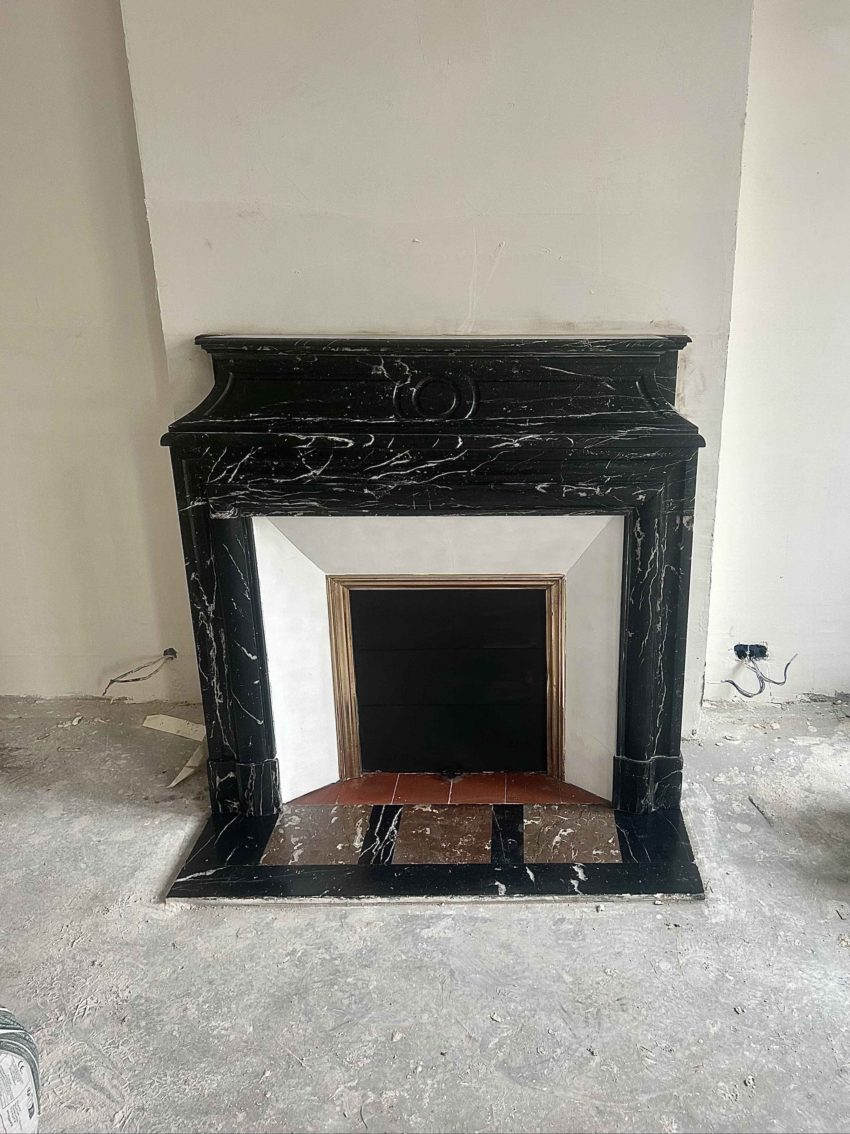 J’ai installé cette belle cheminée il y a quelques jours en région parisienne. Datant du XIXè siècle, cette cheminée de style Louis XIV est en marbre noir Marquina, un marbre d’une couleur noire complètement uniforme avec veines. J’ai fixé le rétrécissement de cette cheminée en émail blanc avec son rideau comme il était d’usage au XIXè siècle. J’ai également réalisé l’âtre en briquettes réfractaires afin d’avoir une parfaite résistance au feu de bois.
