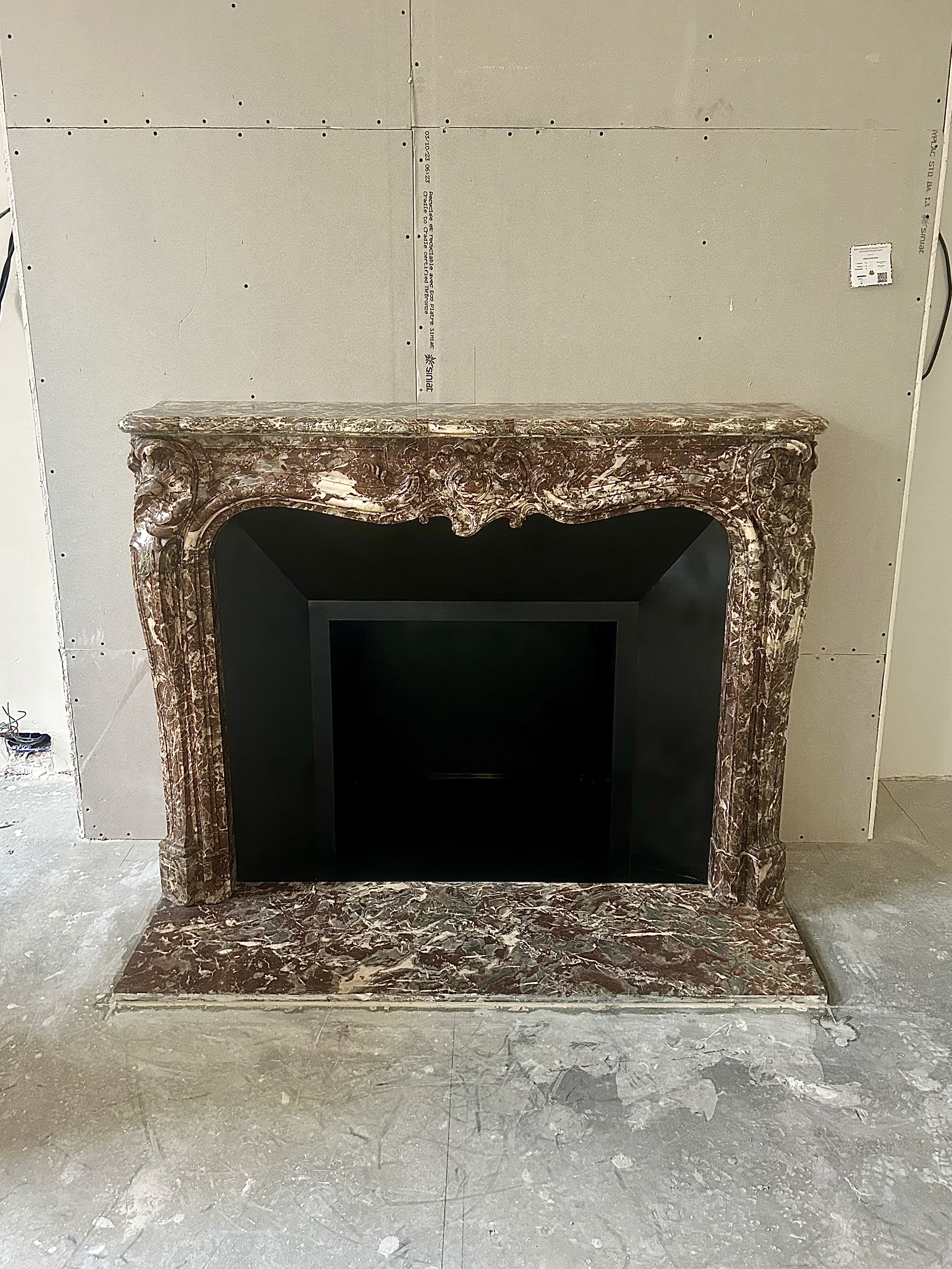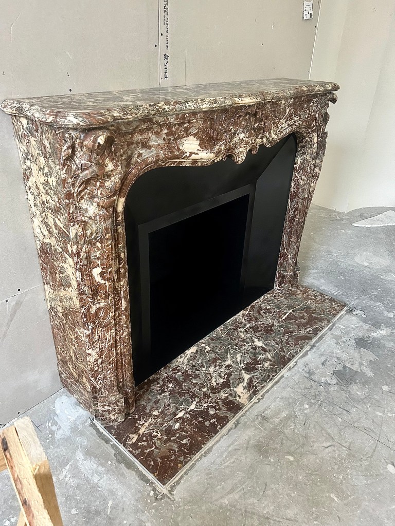 Voici une belle cheminée d’époque Louis XV en marbre Rouge avec son riche décor de style rocaille. On la distingue aussi par son linteau asymétrique entrelacé de feuillages.