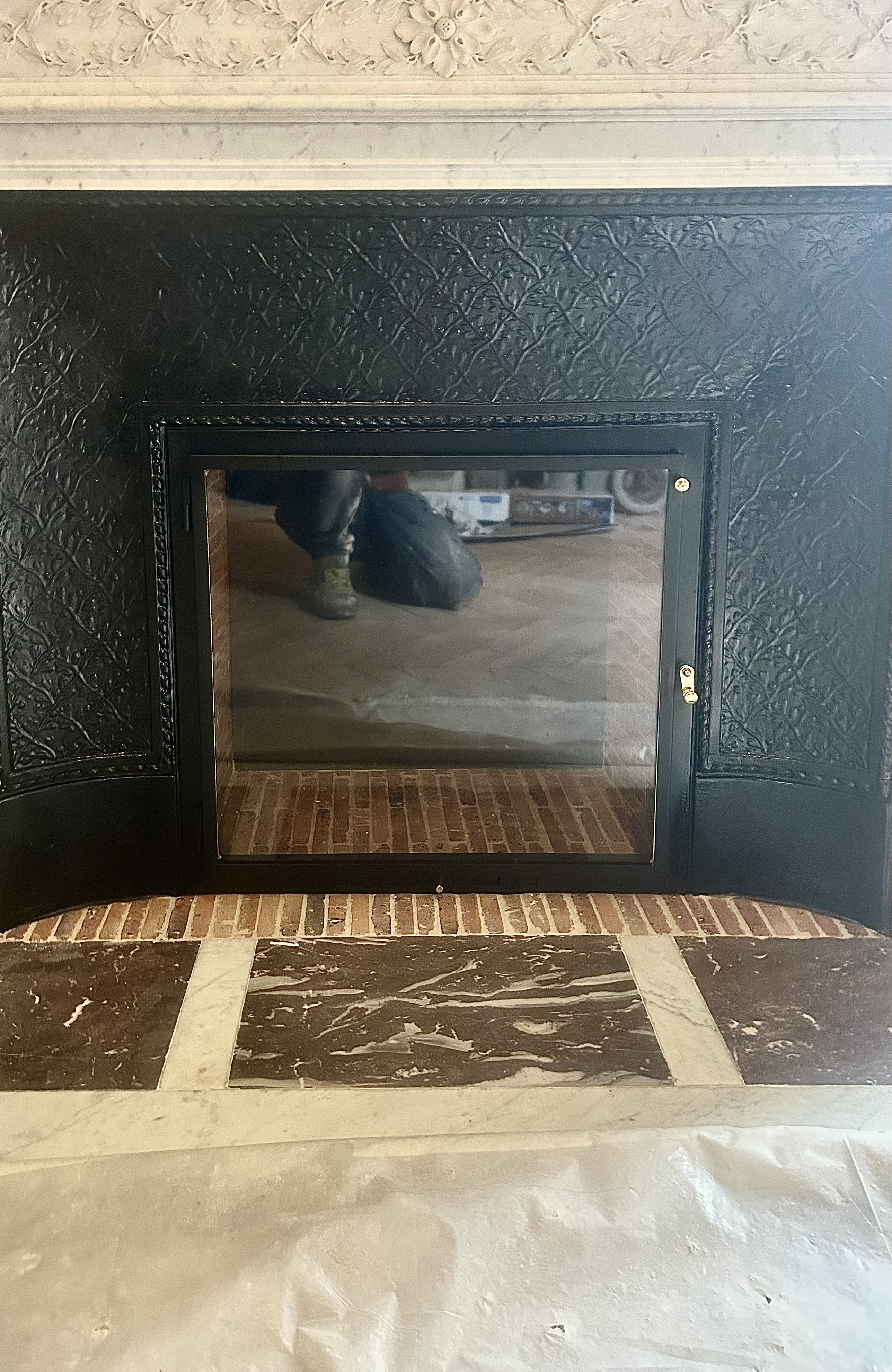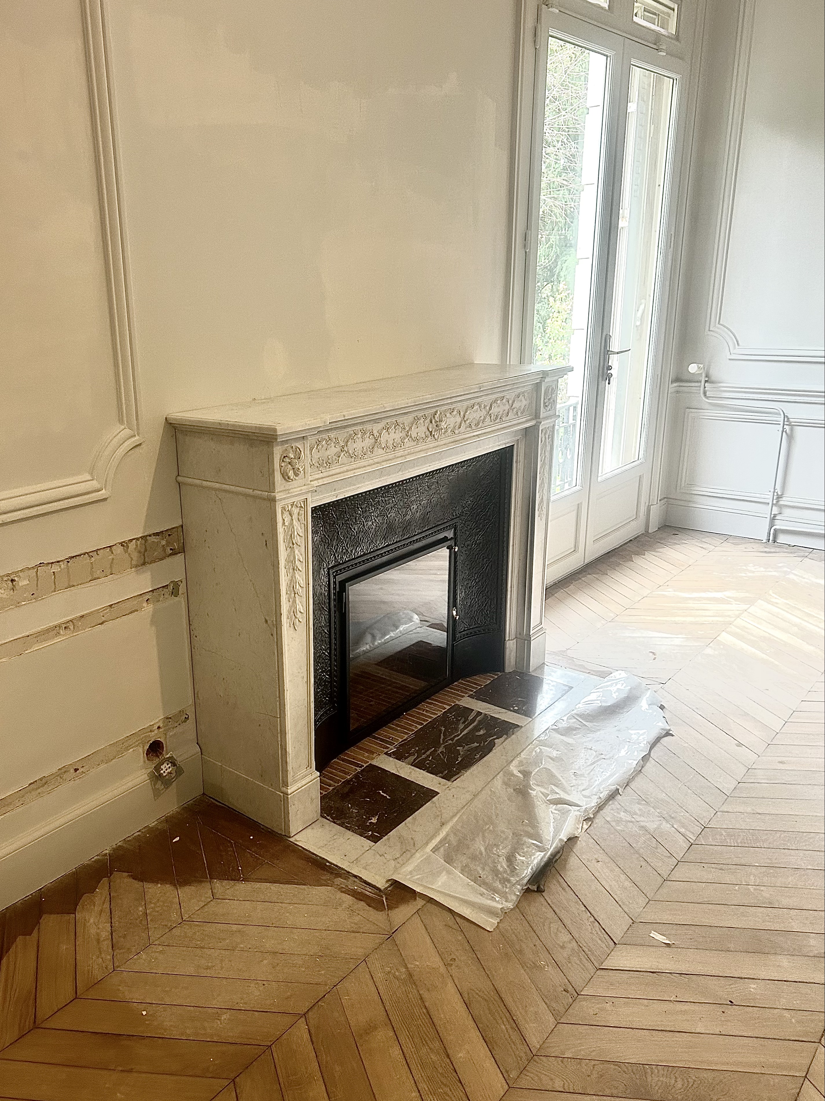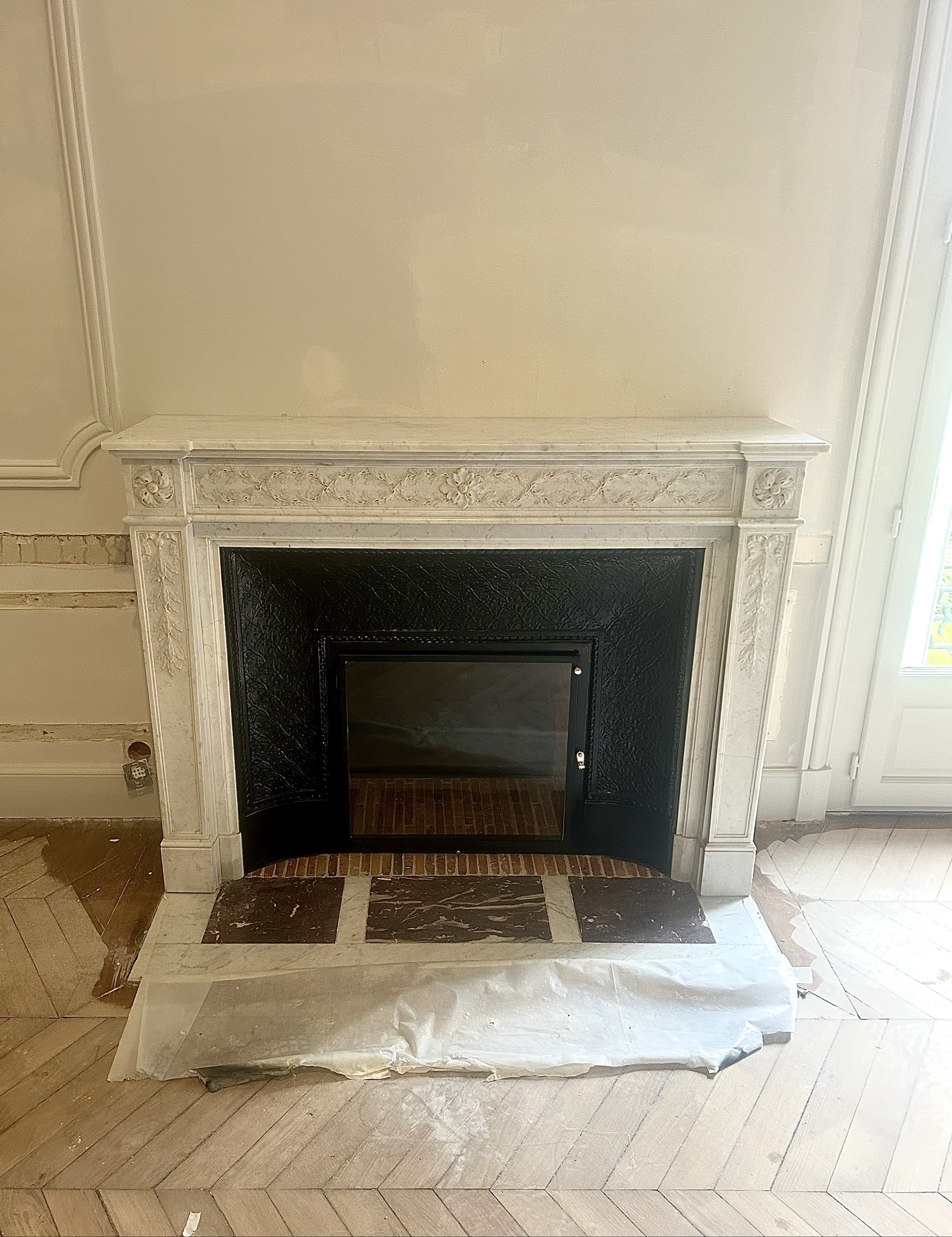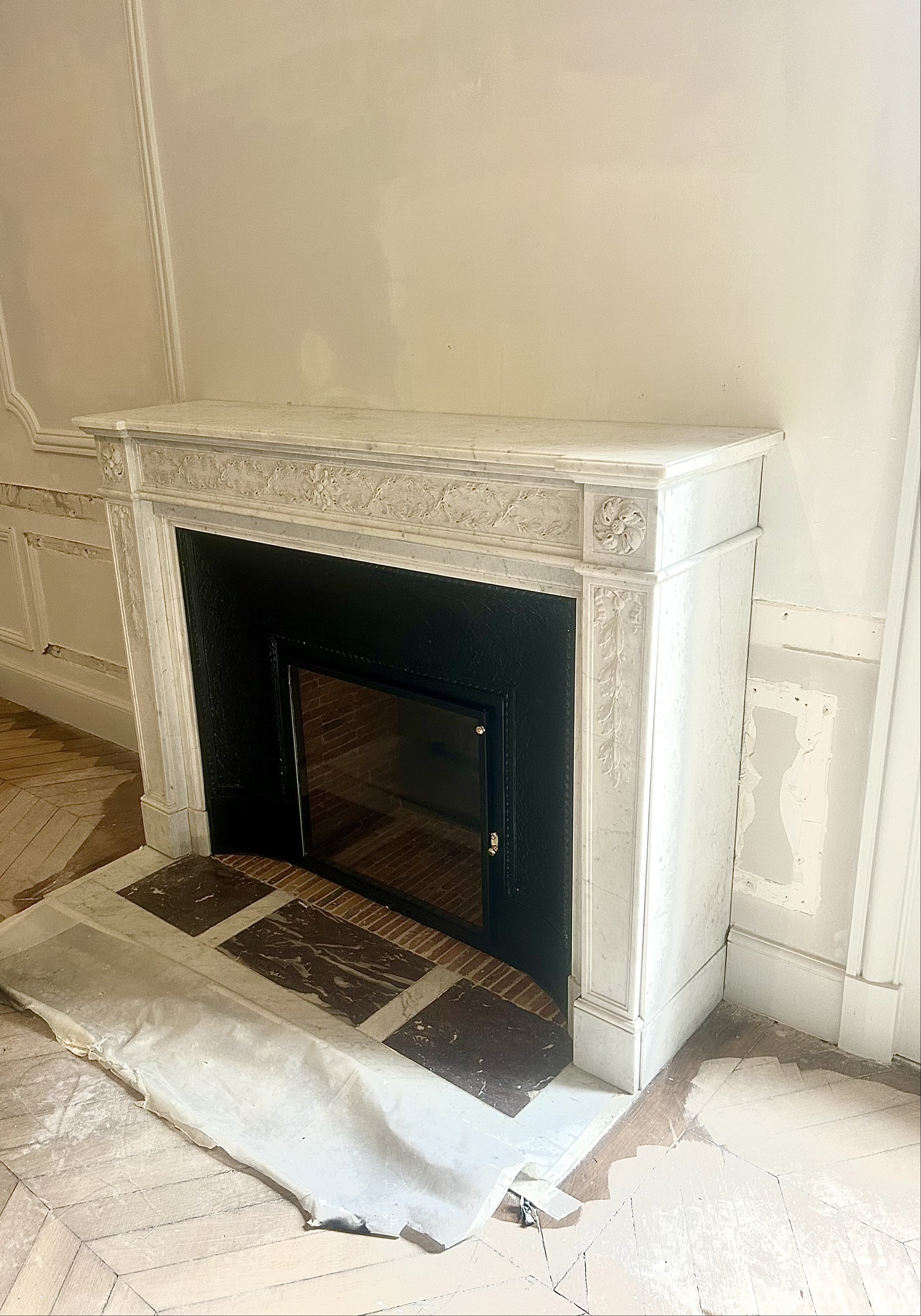 Voici une cheminée de style Louis XVI blanc carrare richement orné, avec sa fonte ainsi que sa plaque de sol d’origine. Il me semble que cette cheminée doit être une pièce très rare : les sculptures sont d’une rare finesse.