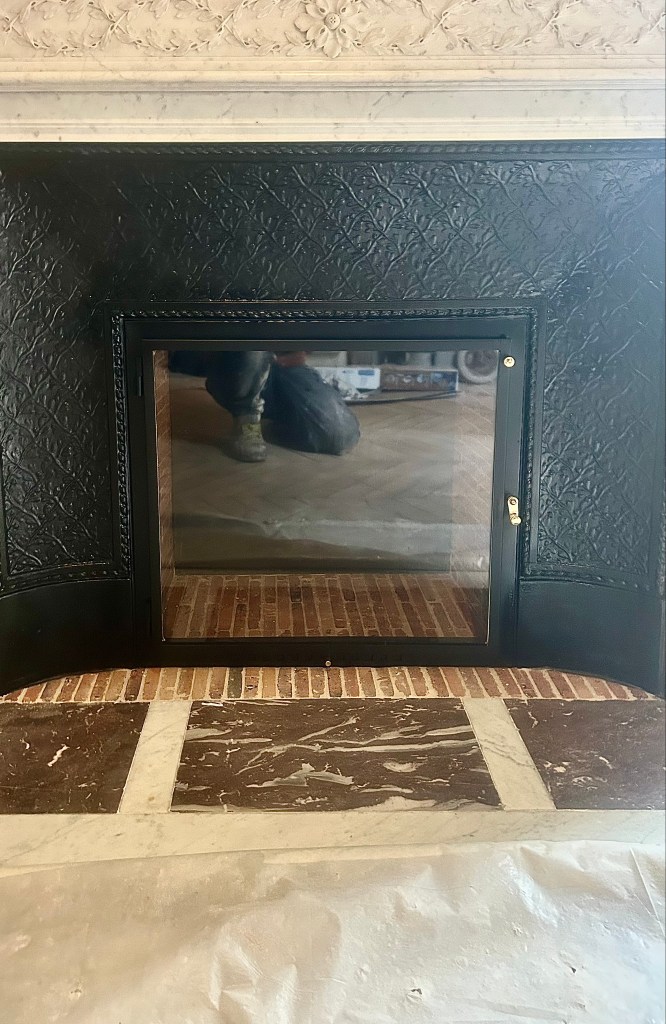La particularité de cette installation fut la demande du propriétaire de pouvoir installer un foyer en briquettes fabriqué sur-mesure et d’y ajouter une porte vitrée.