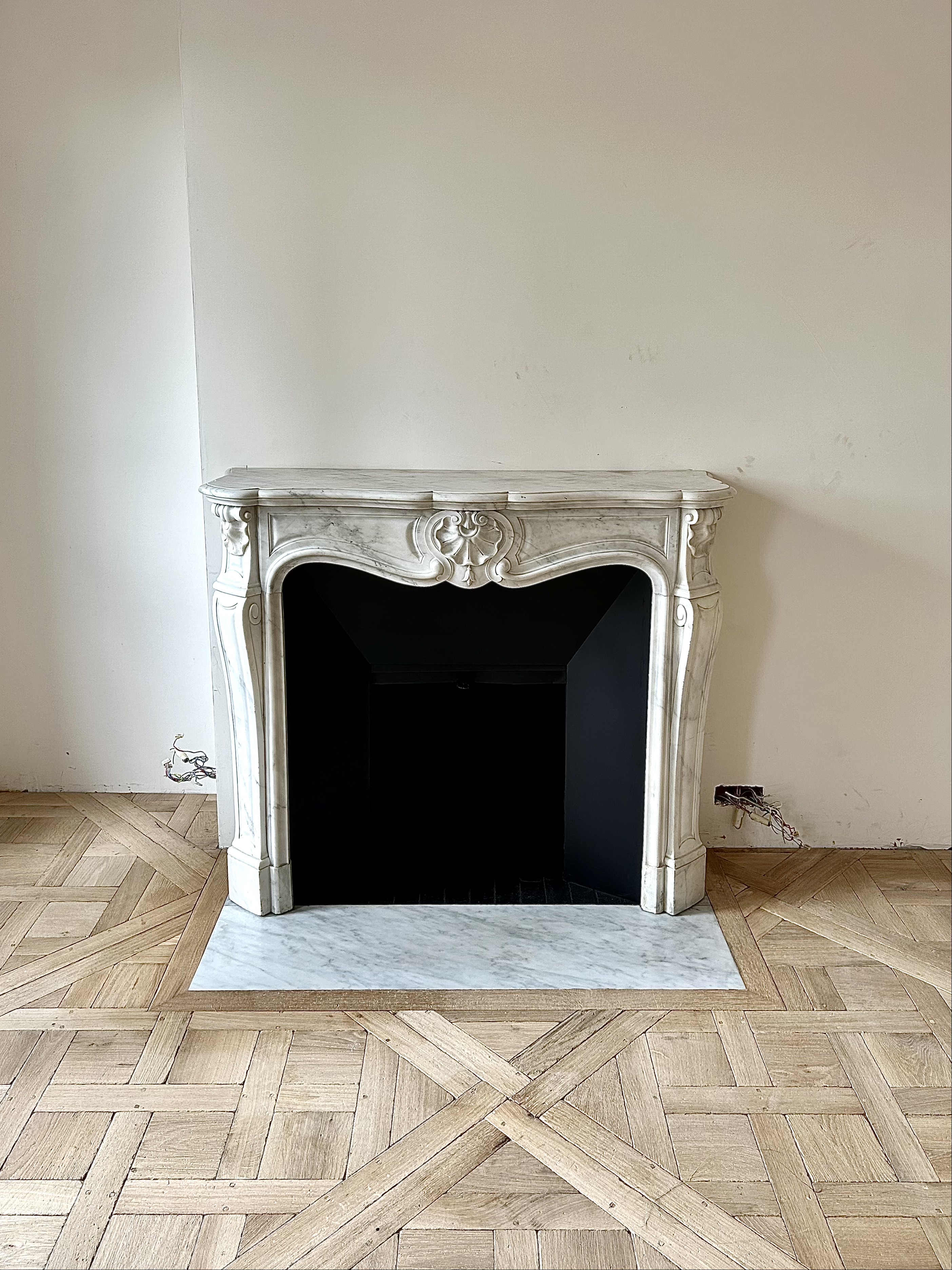 Voici une cheminée de style Louis XV, un modèle que l’on appelle « trois coquilles », en marbre de Carrare. La particularité de cette installation fut la demande du propriétaire de pouvoir installer un foyer en acier/briques peint en noir fabriqué sur-mesure. Après avoir installé la dalle de sol en marbre uni, j’ai préparé un intérieur avec un rétrécis en acier noir ainsi que des briques réfractaires peintes en noir. Le foyer est comme à l’habitude, fermé par un rideau et s’ouvre sur un âtre en briques réfractaires.