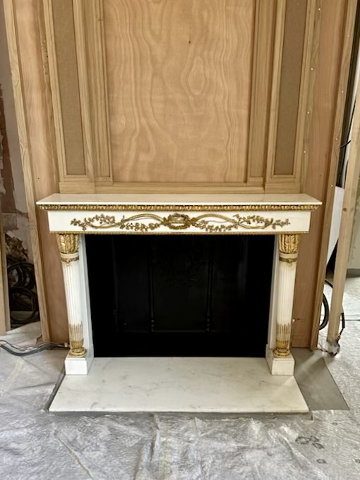 Aujourd’hui, je vous propose de découvrir cette cheminée exceptionnelle de style Empire à colonnes détachées réalisée dans un marbre blanc statuaire. C’est un marbre très blanc accompagné de son généreux ornement en bronze situé sur le bandeau et les colonnes.