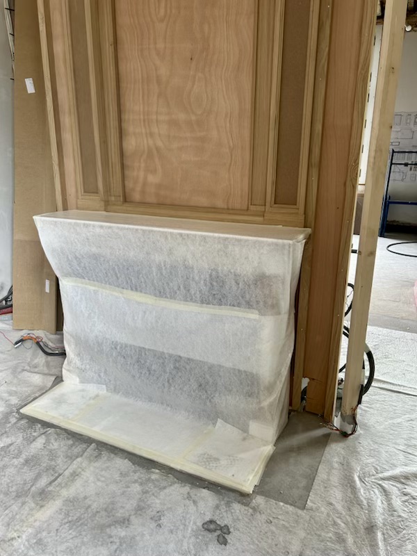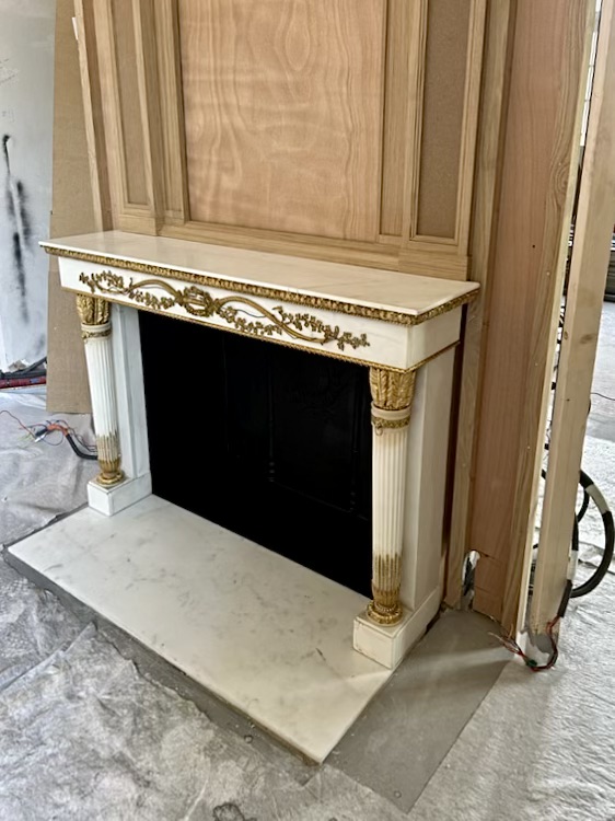Cette cheminée a été installée dans un château et a la chance d’avoir gardé son âtre en plaques de fonte décoré. J’ai donc réalisé le sol du foyer intérieur en fonte, après avoir installé la dalle de sol, également fabriquée dans le même marbre.