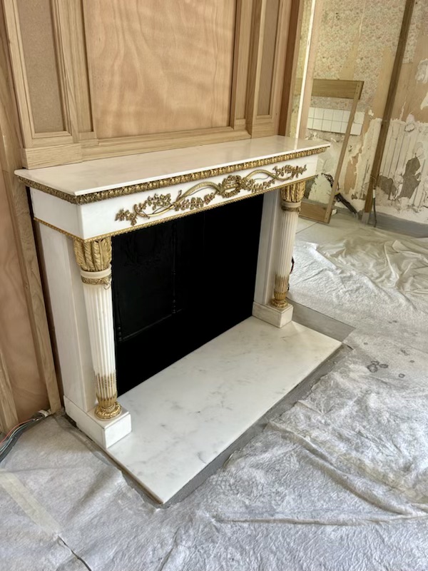 Cette cheminée a été installée dans un château et a la chance d’avoir gardé son âtre en plaques de fonte décoré. J’ai donc réalisé le sol du foyer intérieur en fonte, après avoir installé la dalle de sol, également fabriquée dans le même marbre.