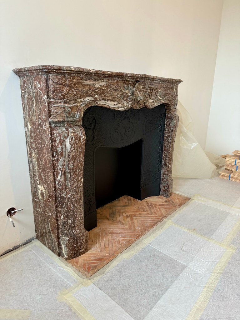 Voici une belle cheminée d’époque Louis XV en marbre Rouge Royal. La partie supérieure (le manteau de cheminée) est finement sculptée avec des motifs floraux et un ornement central en relief qui ressemble à une coquille.