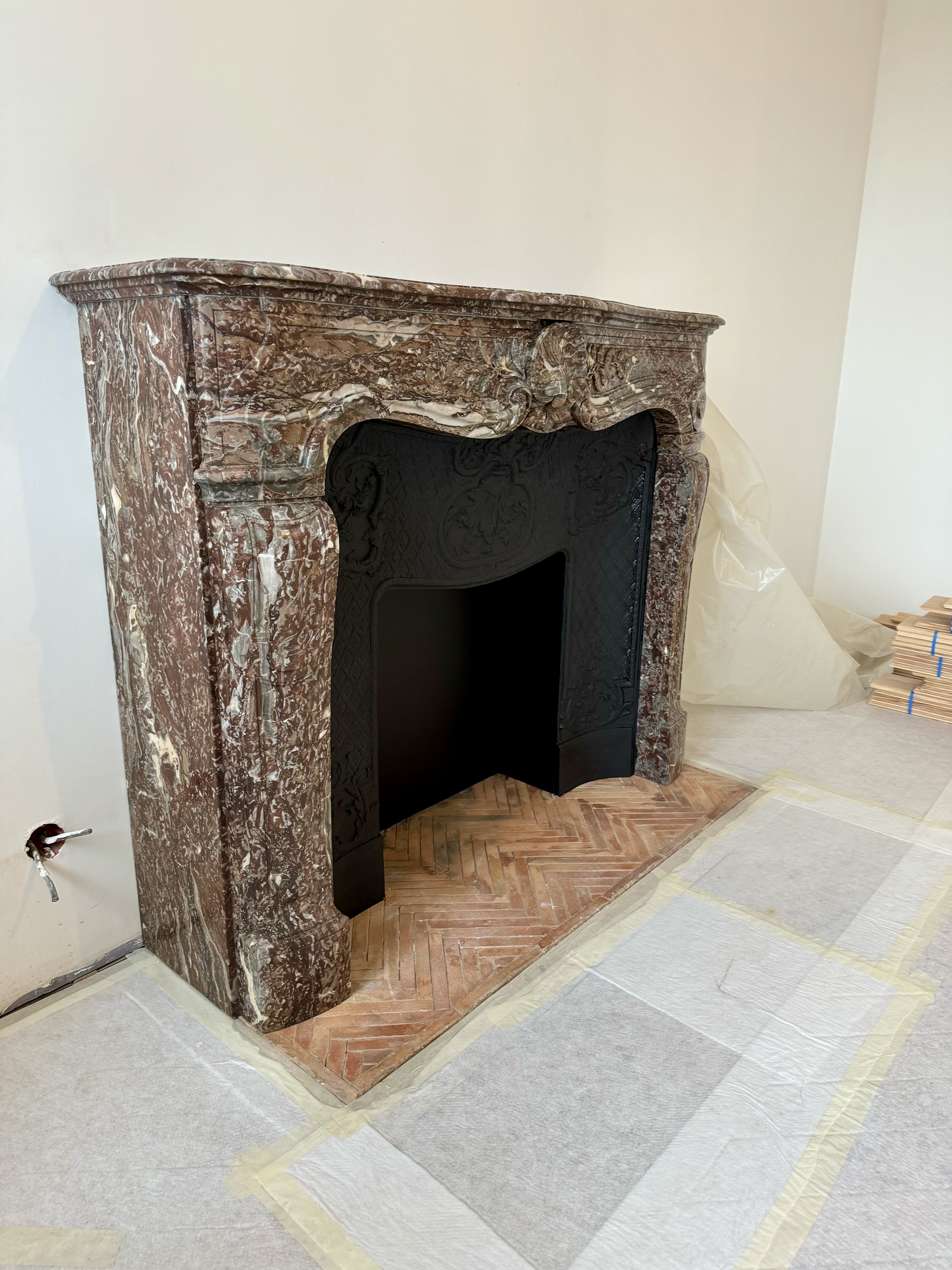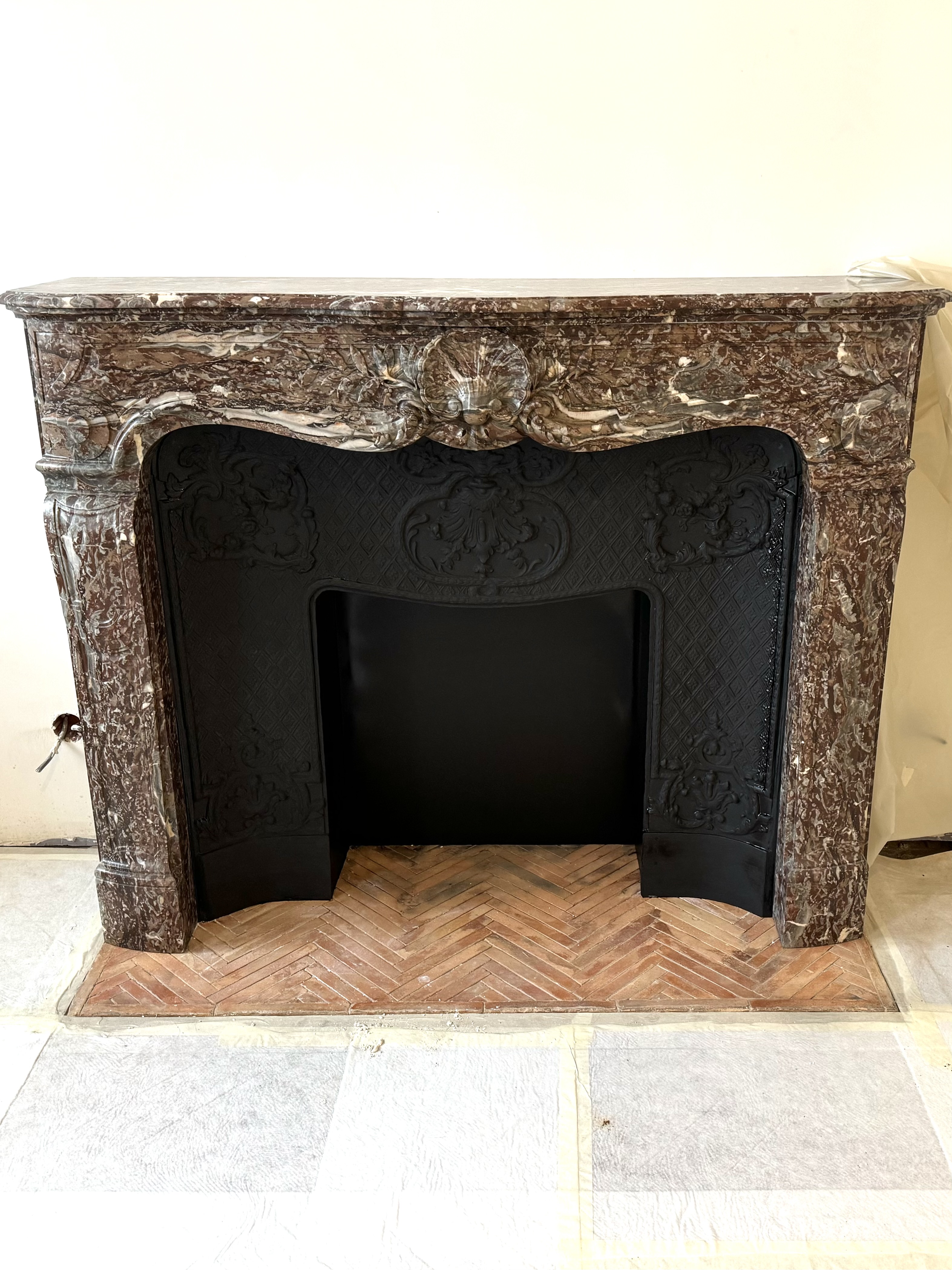 Voici une belle cheminée d’époque Louis XV en marbre Rouge Royal. La partie supérieure (le manteau de cheminée) est finement sculptée avec des motifs floraux et un ornement central en relief qui ressemble à une coquille.
