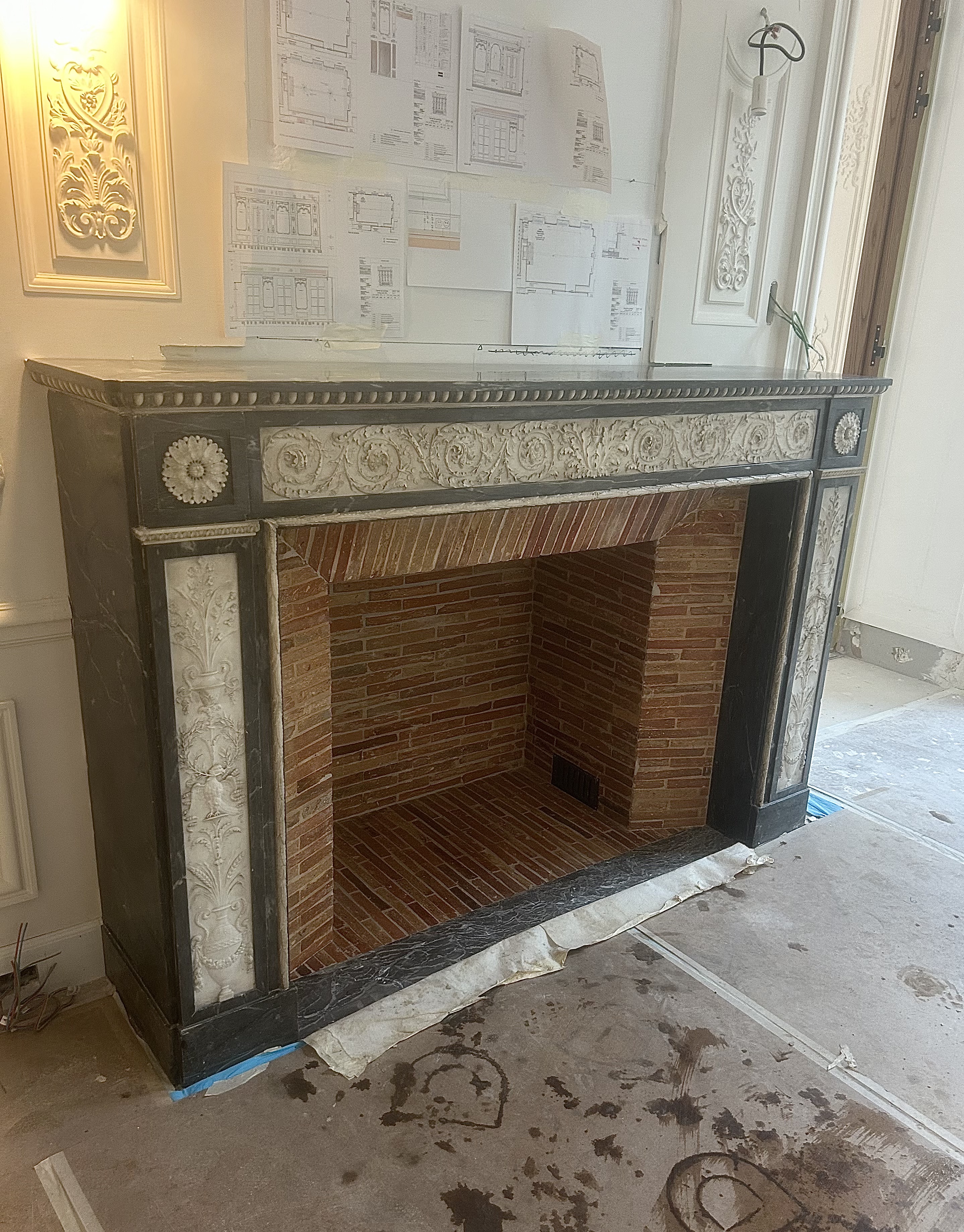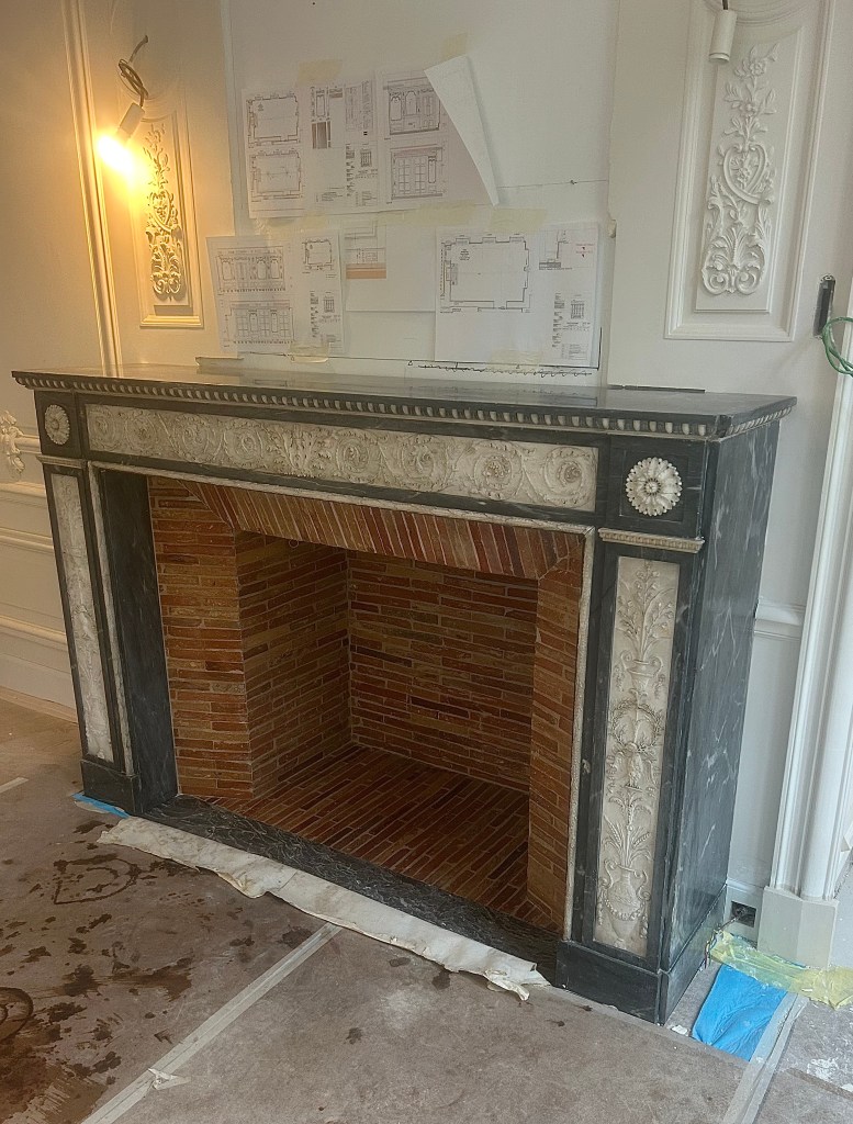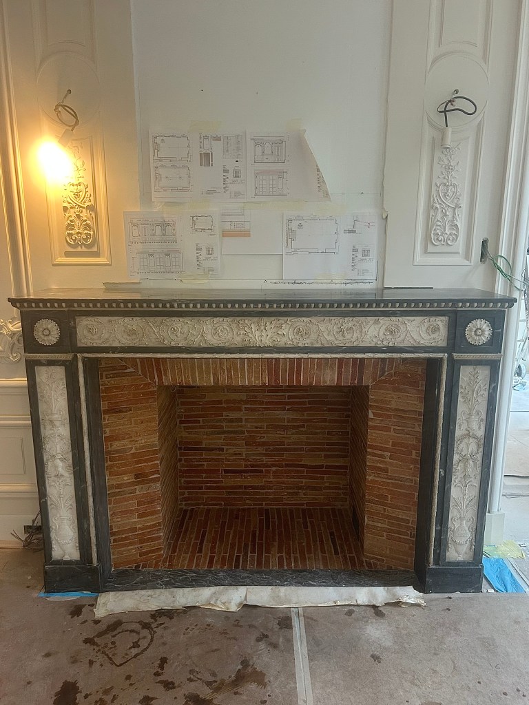 Je vous présente une très belle cheminée de style Empire bi-ton en marbre bleu turquin incrusté d’un marbre blanc richement sculpté.