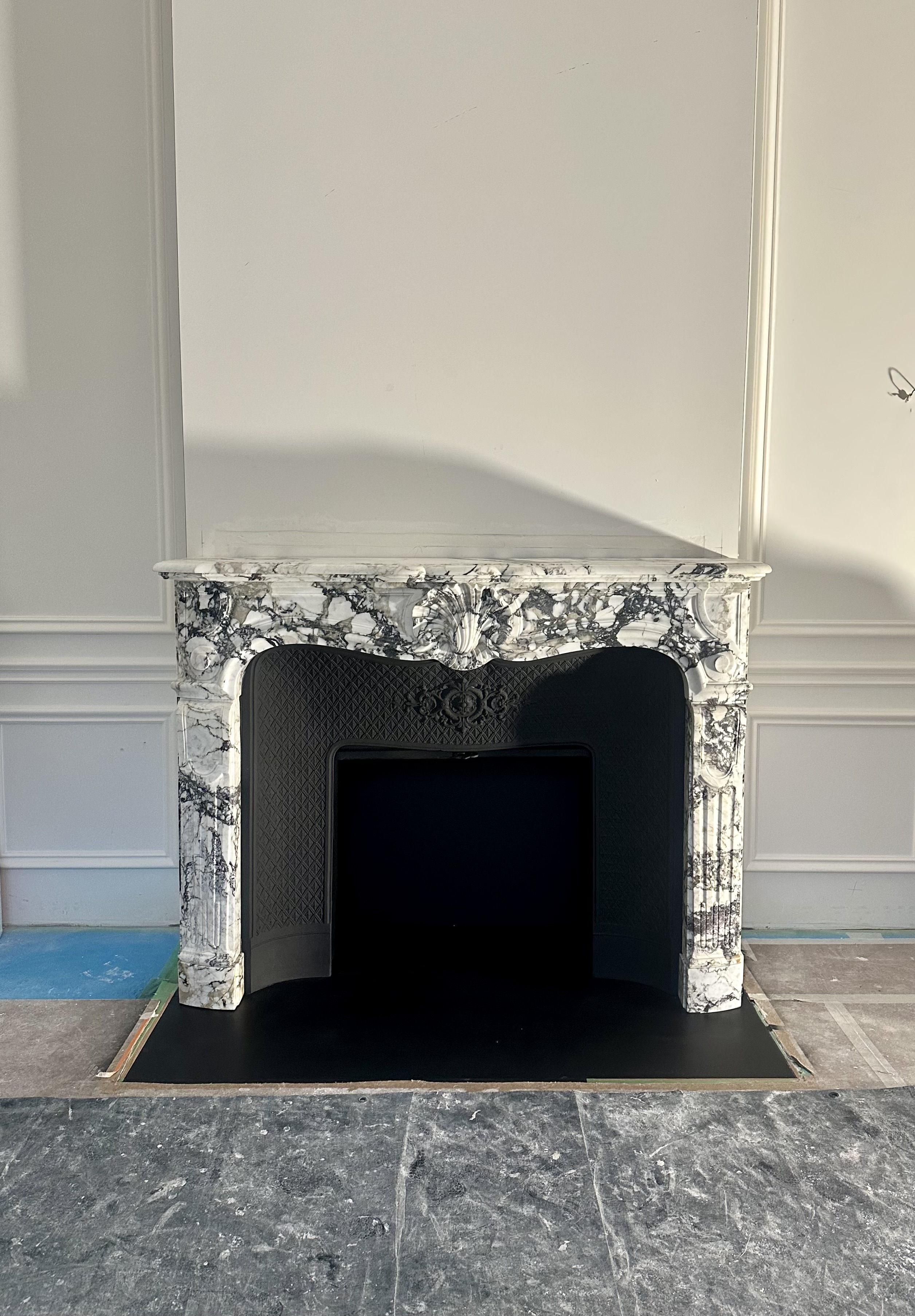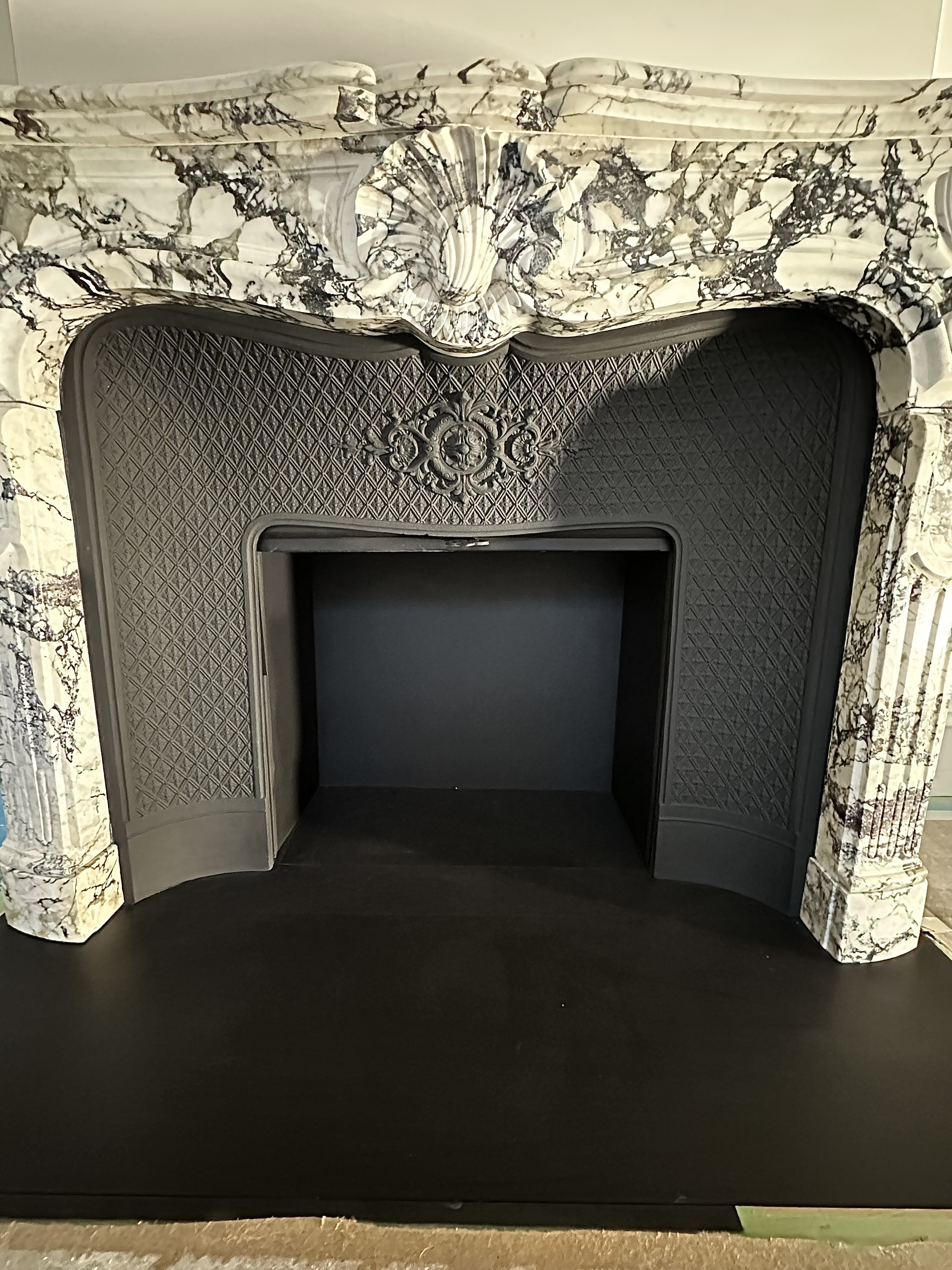 Nous avons posé la cheminée sur la plaque de sol en acier (sur-mesure) et l’on a ajouté sa fonte décorée ainsi que son rideau. Par la suite nous avons réalisé son intérieur sur mesure à partir de plaques en acier que l’on a peintes en noir. On remarque donc qu’il se marie très bien avec la cheminée et le style de l’appartement haussmannien.
