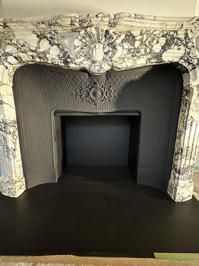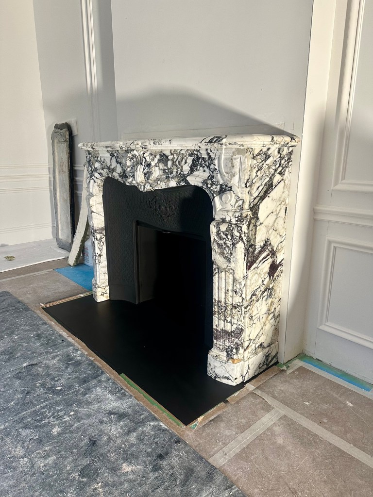 Je vous présente l’installation d’une grande cheminée d’1m60 conçue d’un marbre exceptionnel que l’on appelle « Seravezza ».