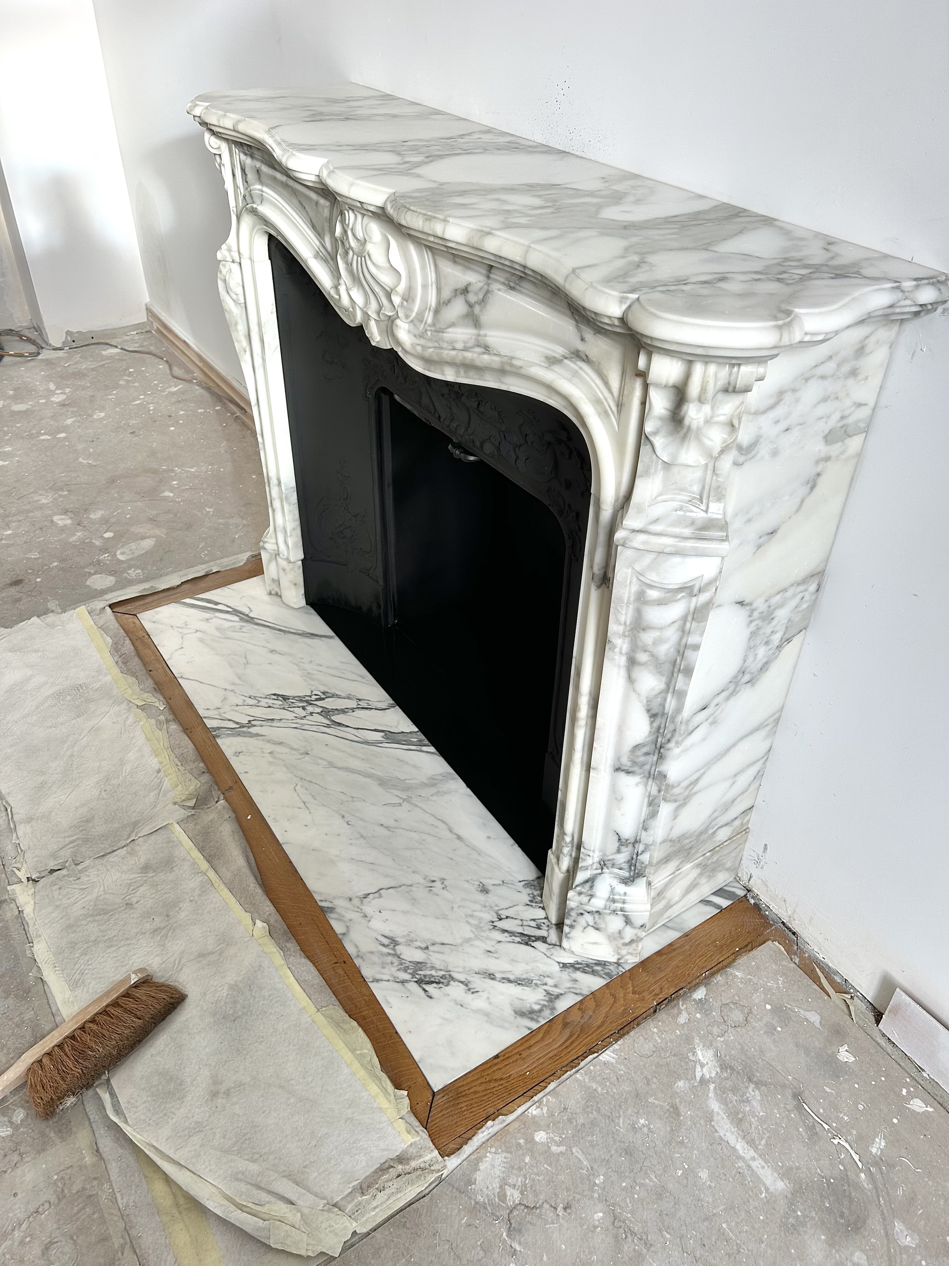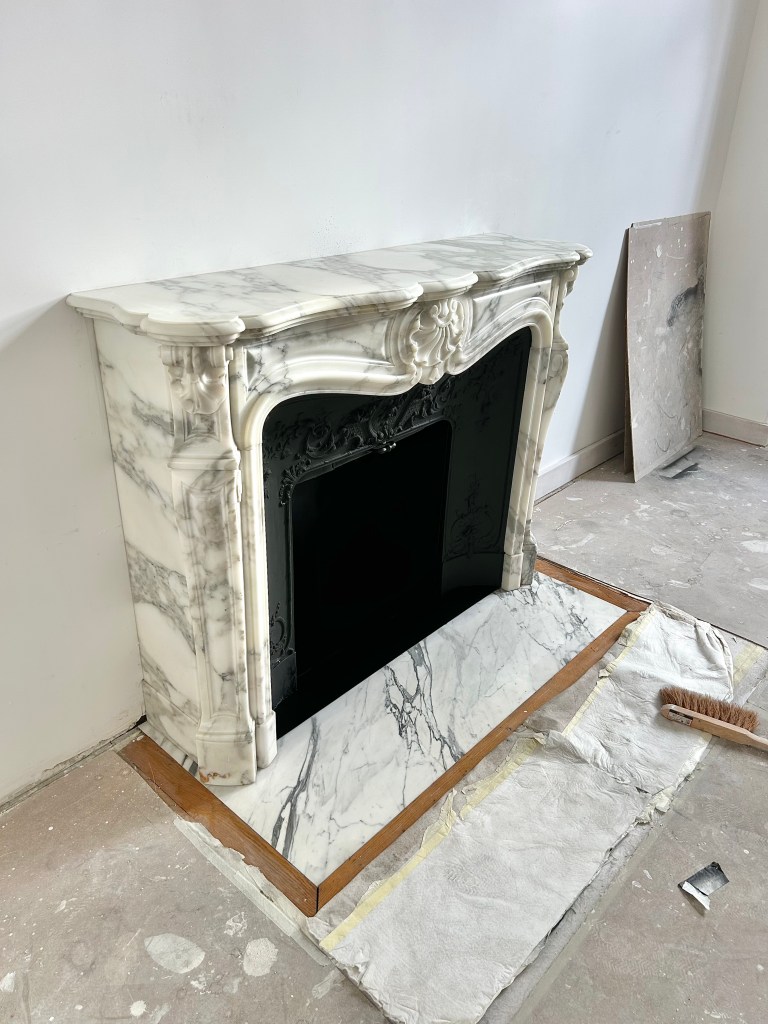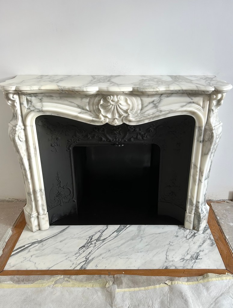 Je vous présente une cheminée de style Louis XV réalisée dans un beau marbre que l’on appelle : « Arabescato ». Il faut savoir que cette cheminée a été réalisée dans le but d’être fonctionnelle.