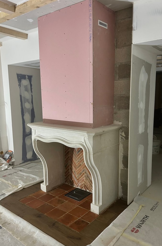 Le client a choisi une cheminée fonctionnelle, dotée d’un intérieur personnalisé composé de briques anciennes posées en biais, ainsi que de tomettes au sol. La cheminée a été assemblée minutieusement, élément par élément, en débutant par les pieds et en terminant par la tablette.