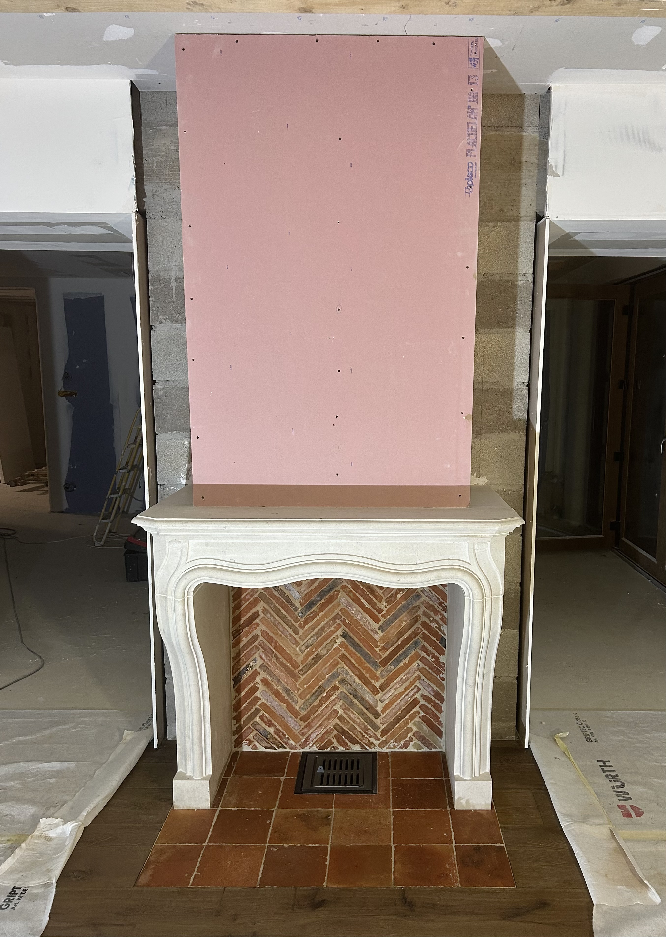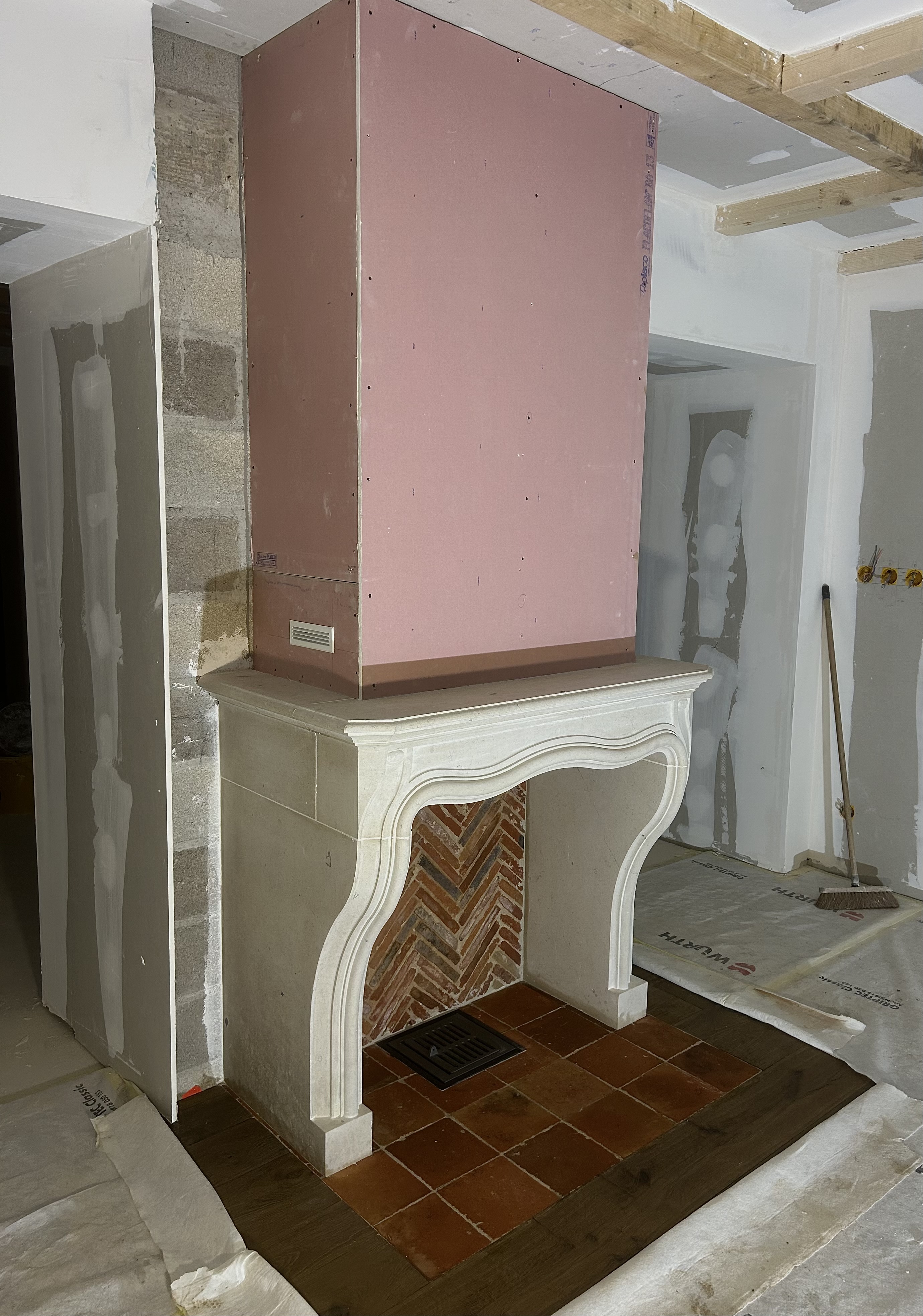 Le client a choisi une cheminée fonctionnelle, dotée d’un intérieur personnalisé composé de briques anciennes posées en biais, ainsi que de tomettes au sol. La cheminée a été assemblée minutieusement, élément par élément, en débutant par les pieds et en terminant par la tablette.