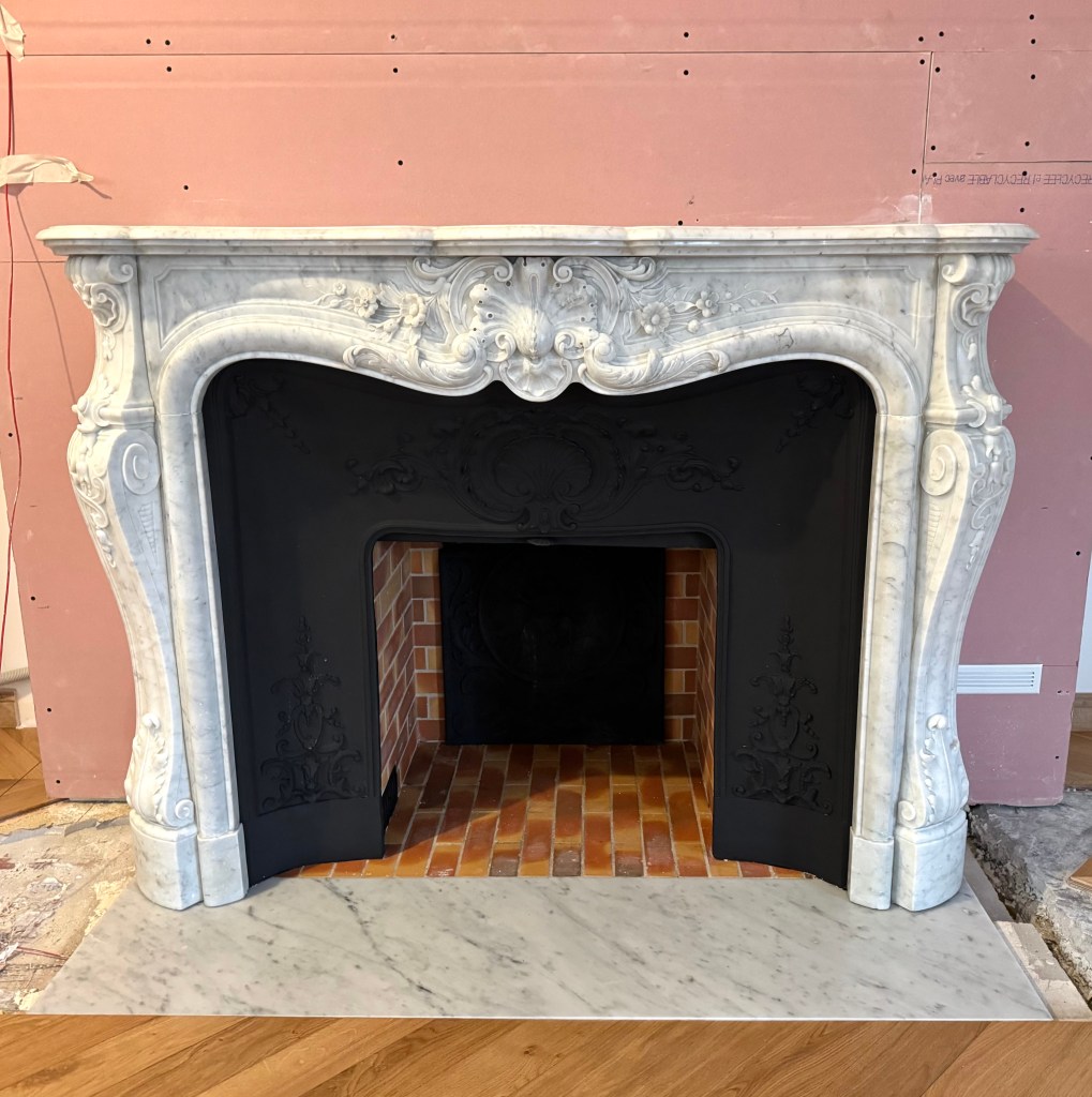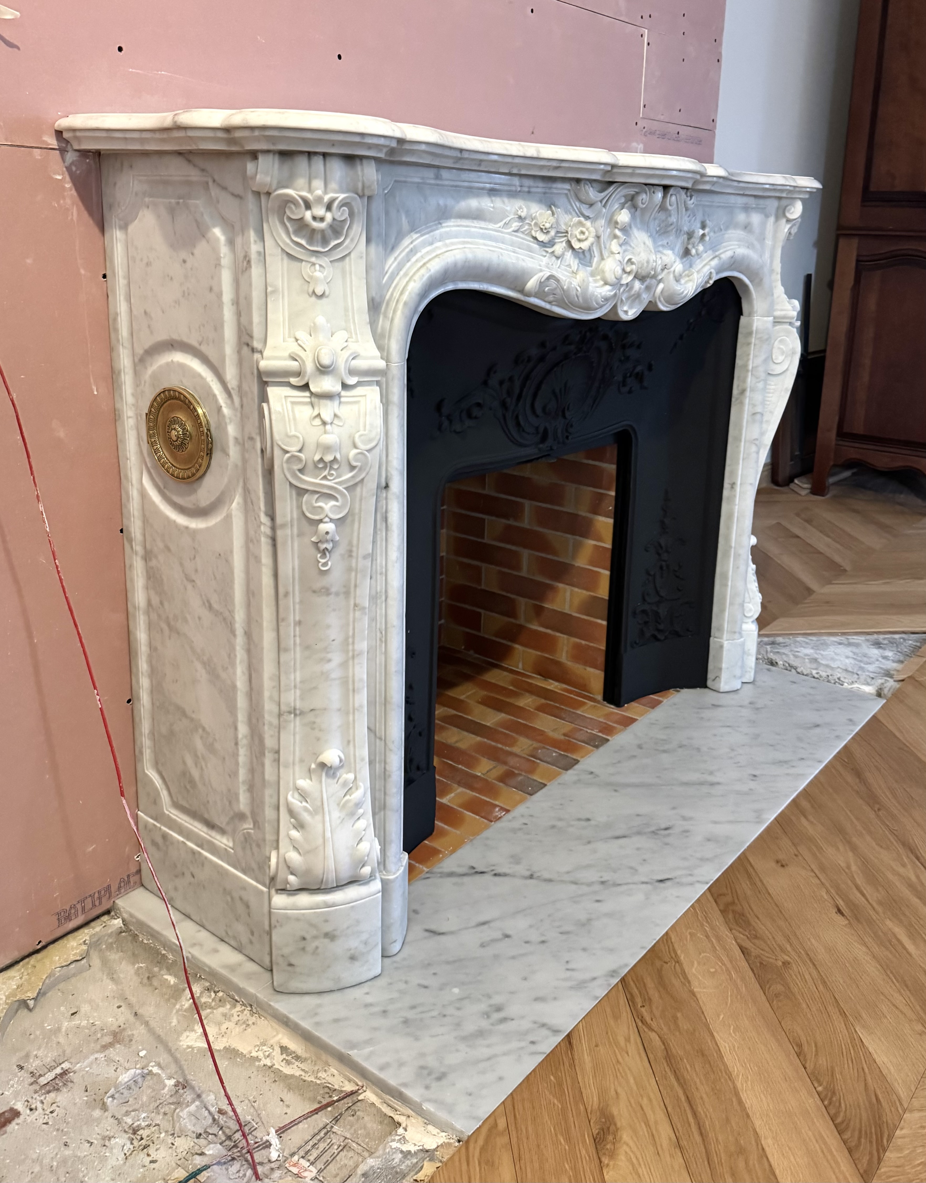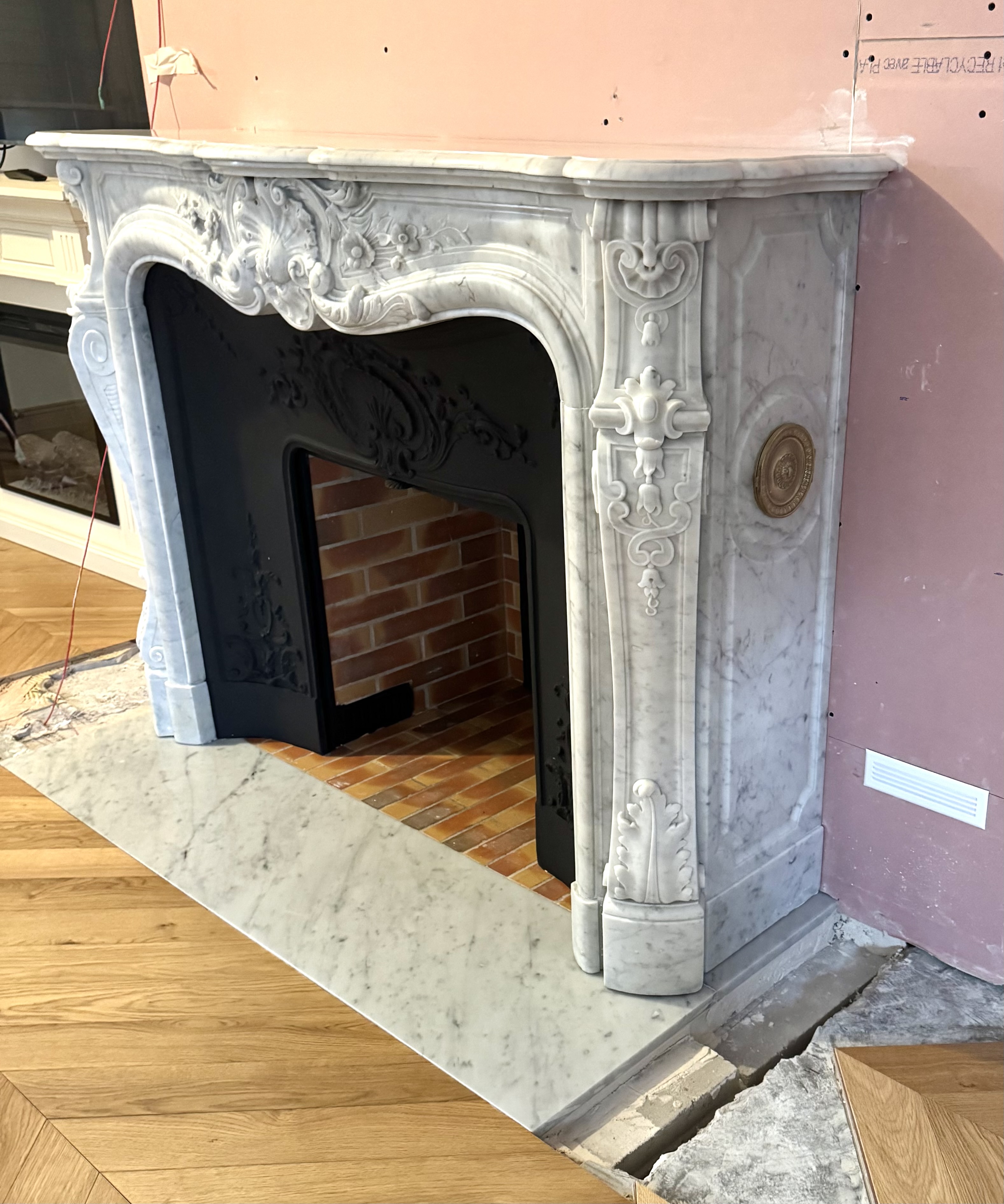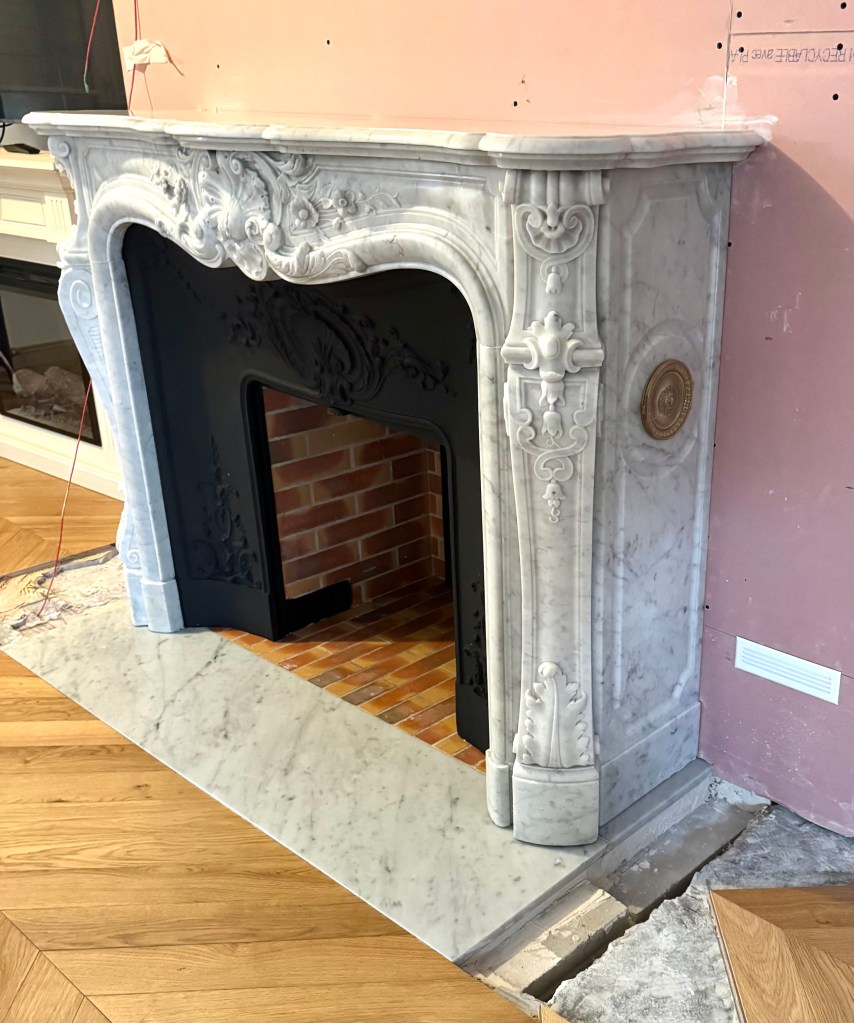 Je vous présente l’installation d’une très belle cheminée de style Louis XV, richement et finement sculptée.