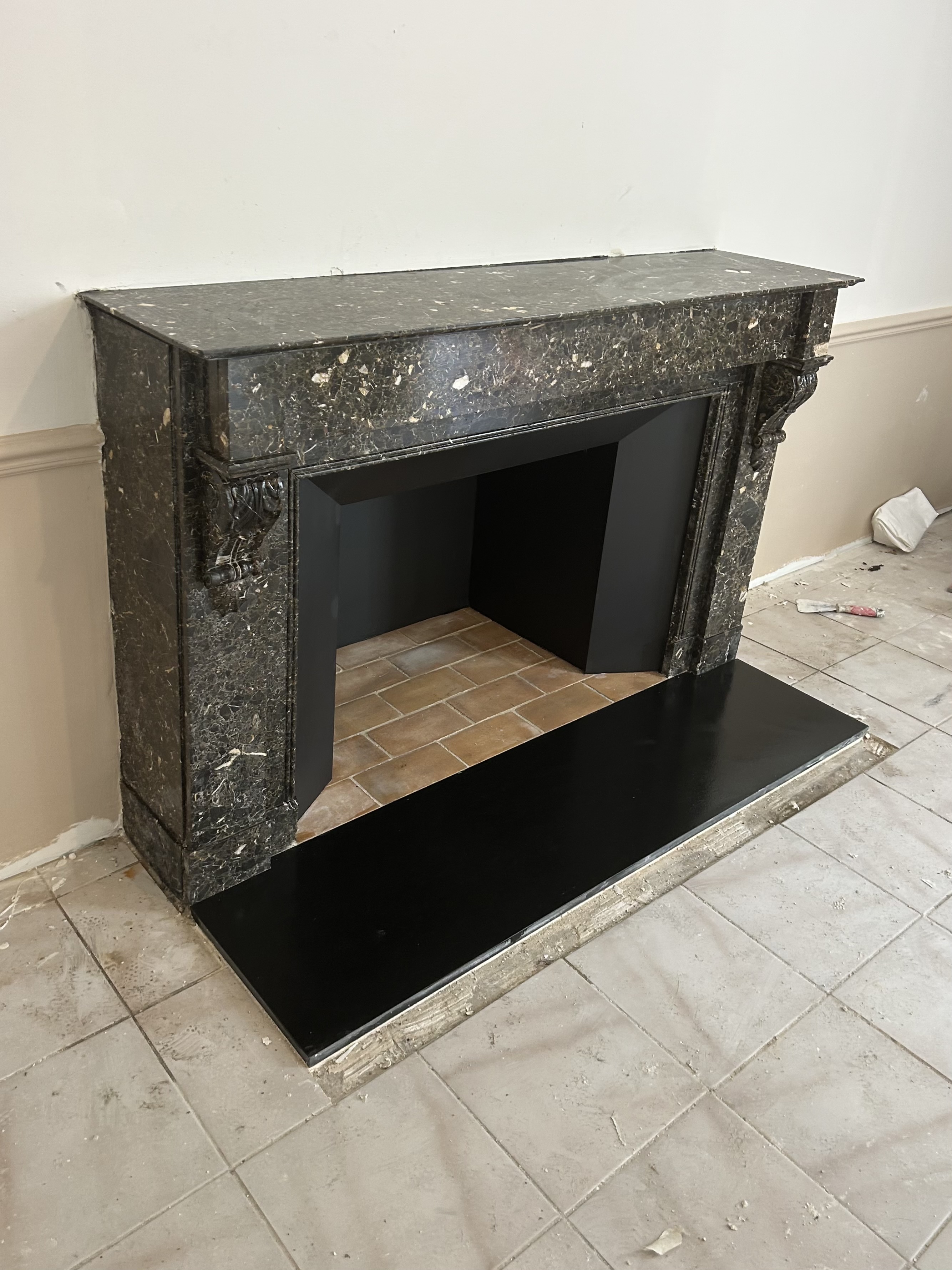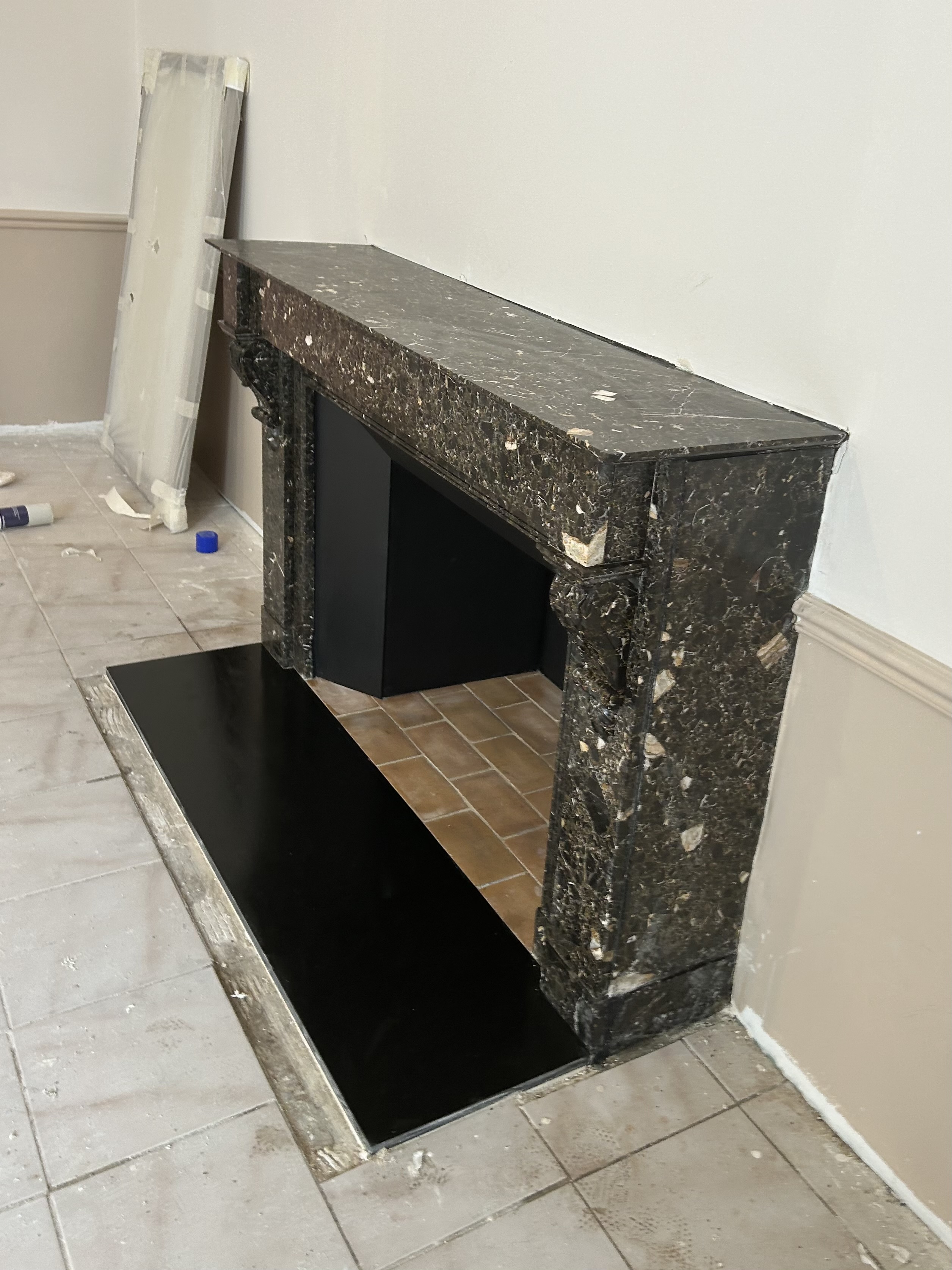 Dans un premier temps, nous avons installé la dalle de sol en marbre « noir fin » uni, ainsi que la cheminée, accompagnée de son rétrécissement de couleur noire. Nous avons ensuite réalisé l’avaloir, afin de rendre l’ensemble pleinement fonctionnel.