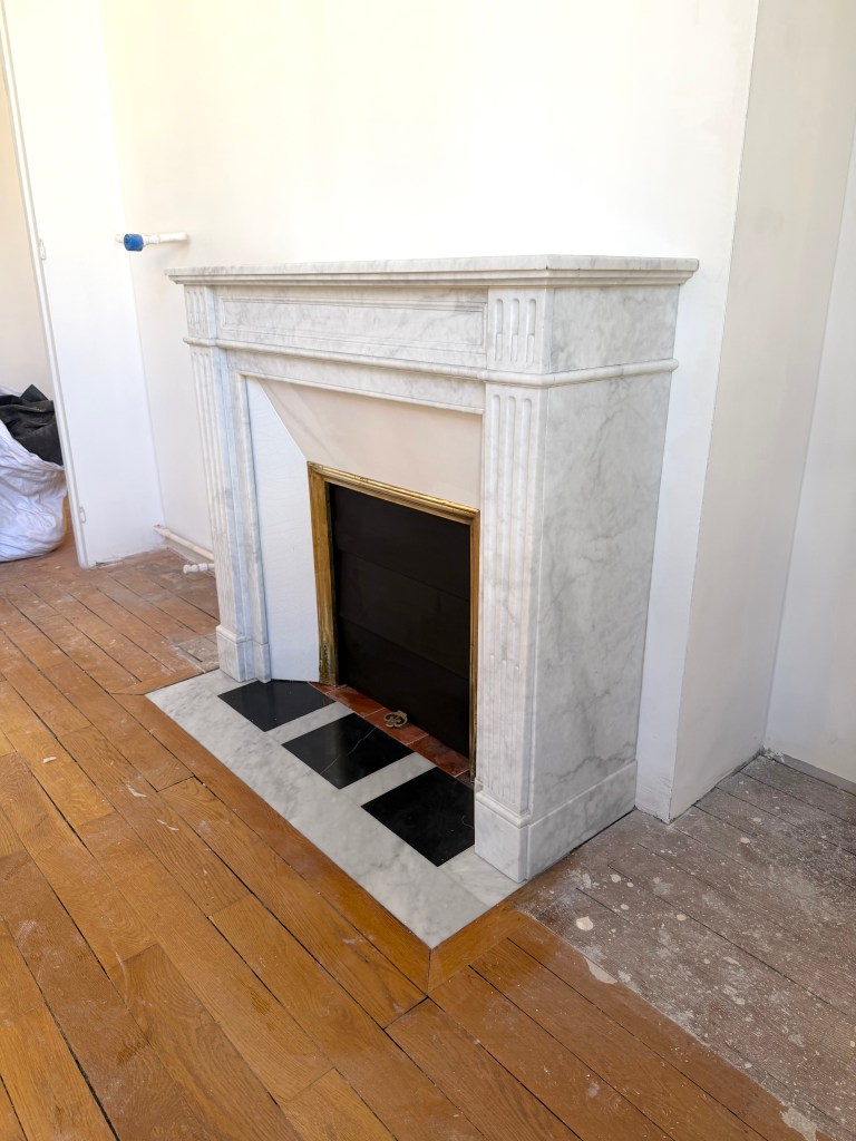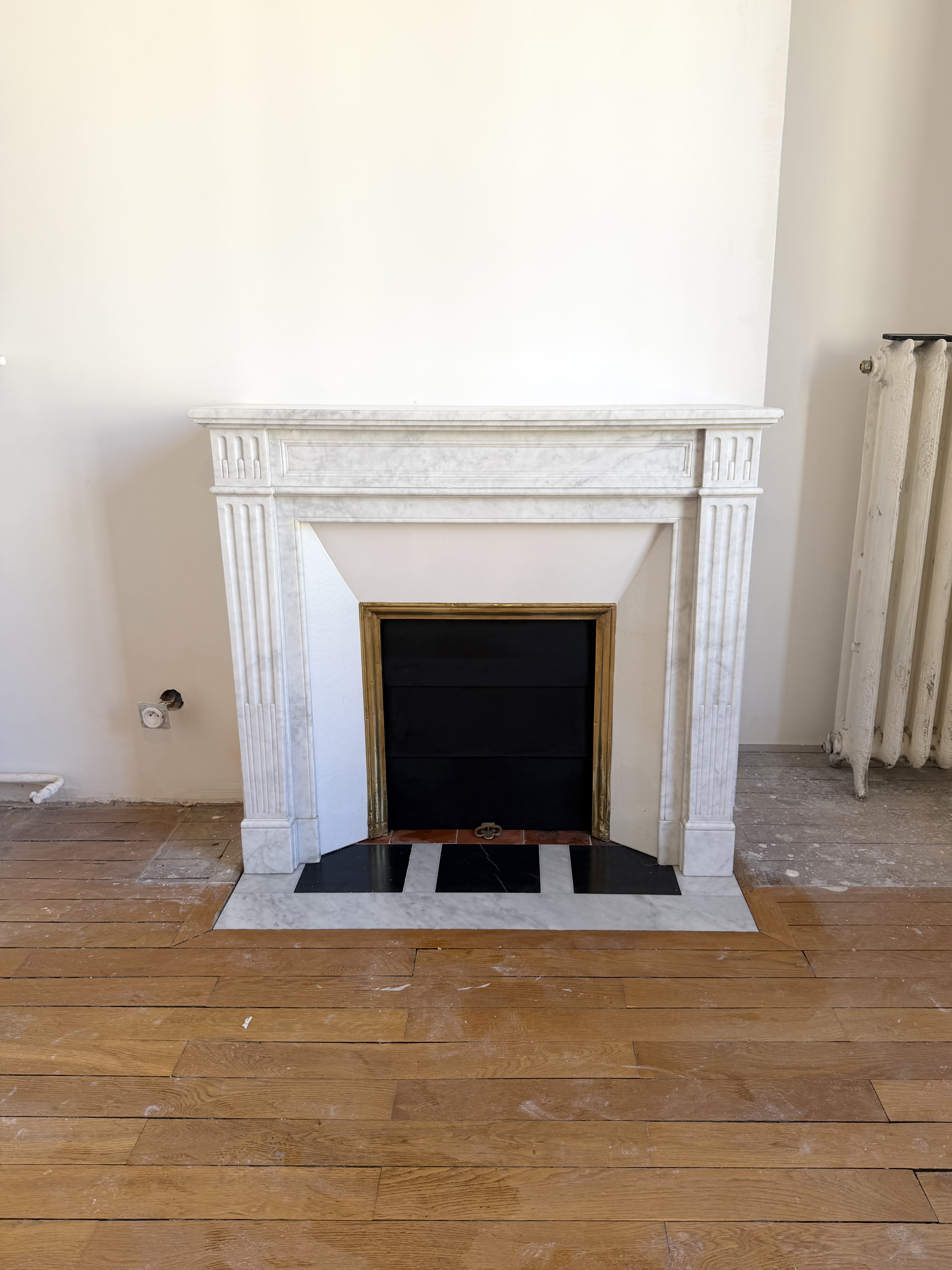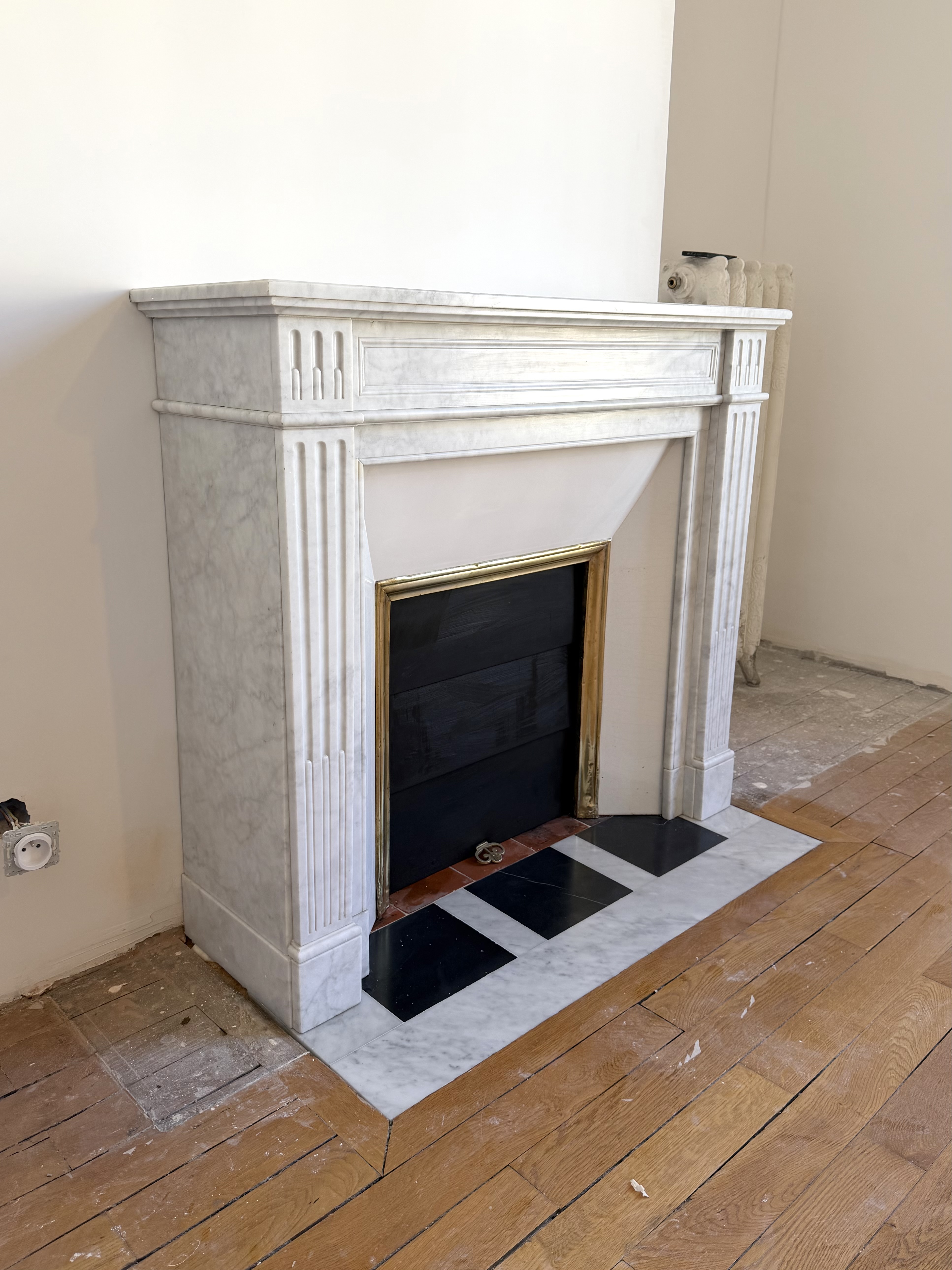 Je vous présente une élégante cheminée de style Louis XVI, réalisée en marbre blanc de Carrare.