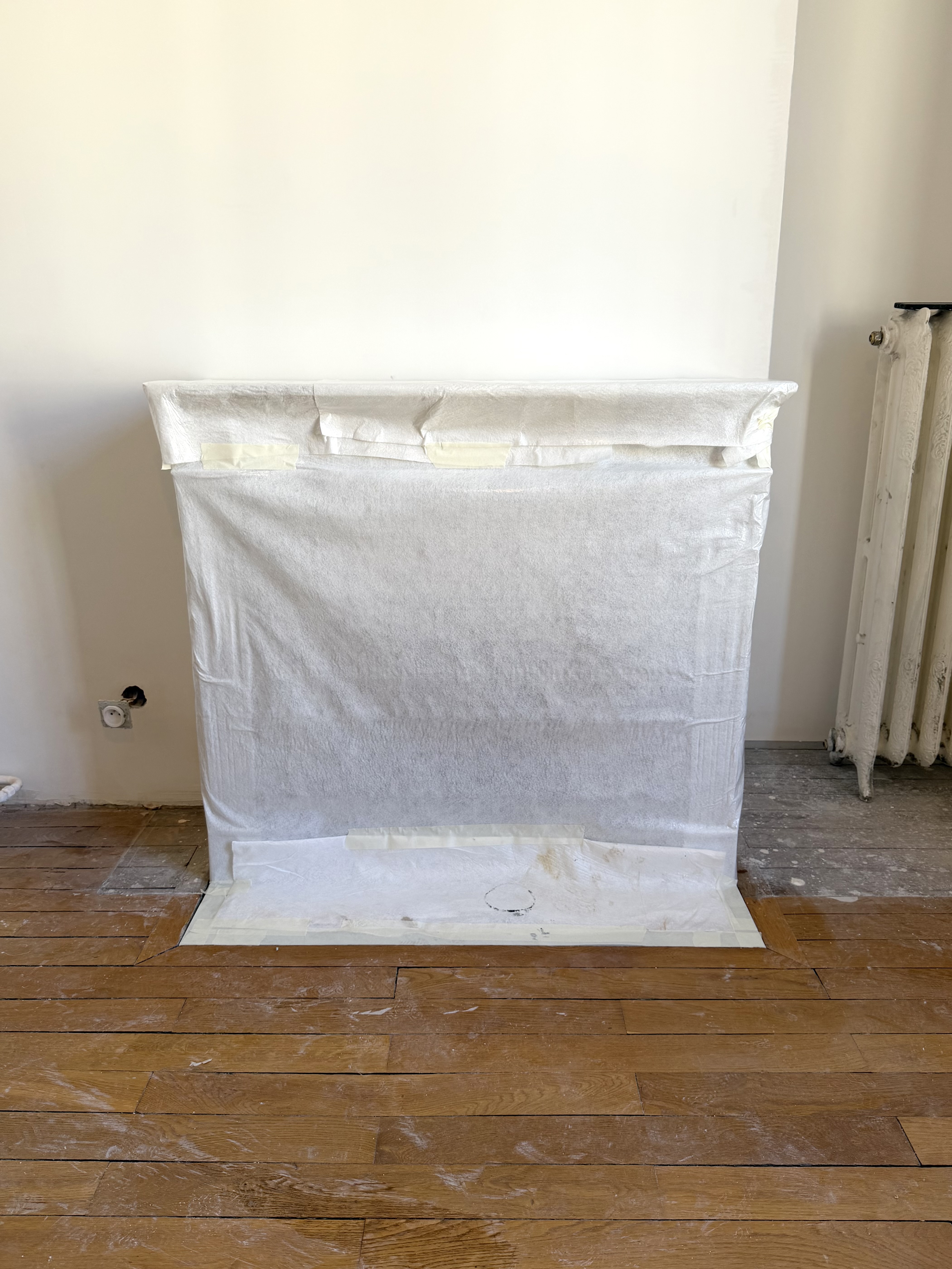 Cette cheminée a été installée à des fins purement décoratives et n’est donc pas fonctionnelle. Nous avons installé la plaque de sol, composée de trois carreaux, sur laquelle la cheminée a ensuite été posée. Nous avons ensuite ajouté des tomettes à l’intérieur du foyer, puis installé les faïences ainsi que le rideau.