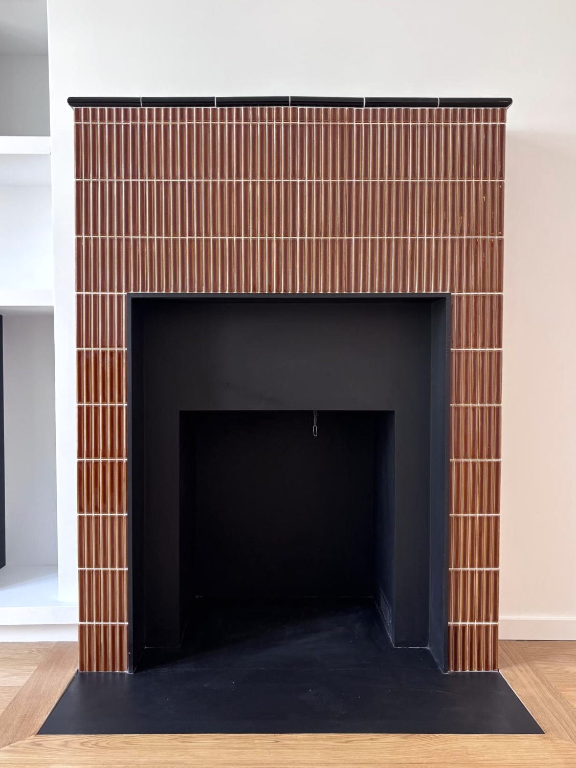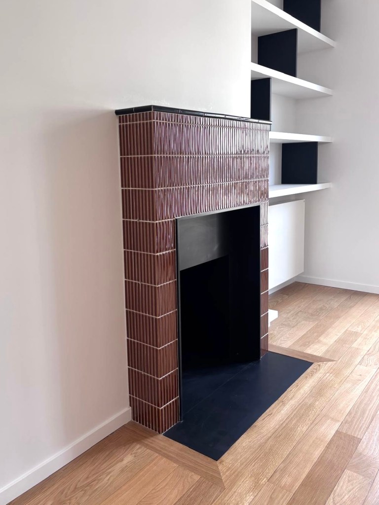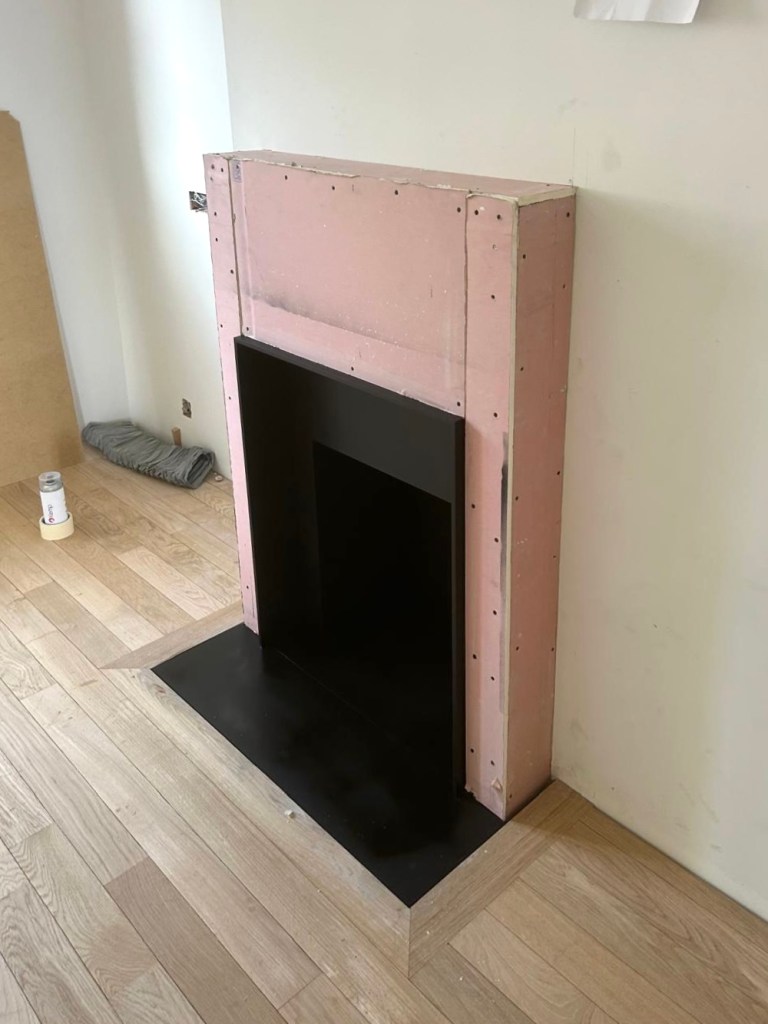 Tout d’abord, nous avons conçu et fabriqué le foyer afin de le rendre pleinement fonctionnel. Celui-ci a été réalisé en métal, puis peint en noir pour apporter une touche résolument moderne. Nous avons ensuite habillé le foyer avec des plaques de BA13, assurant une finition propre et structurée. Enfin, le carreleur est intervenu pour finaliser l’ensemble en posant le carrelage, apportant ainsi l’esthétique finale à la cheminée.