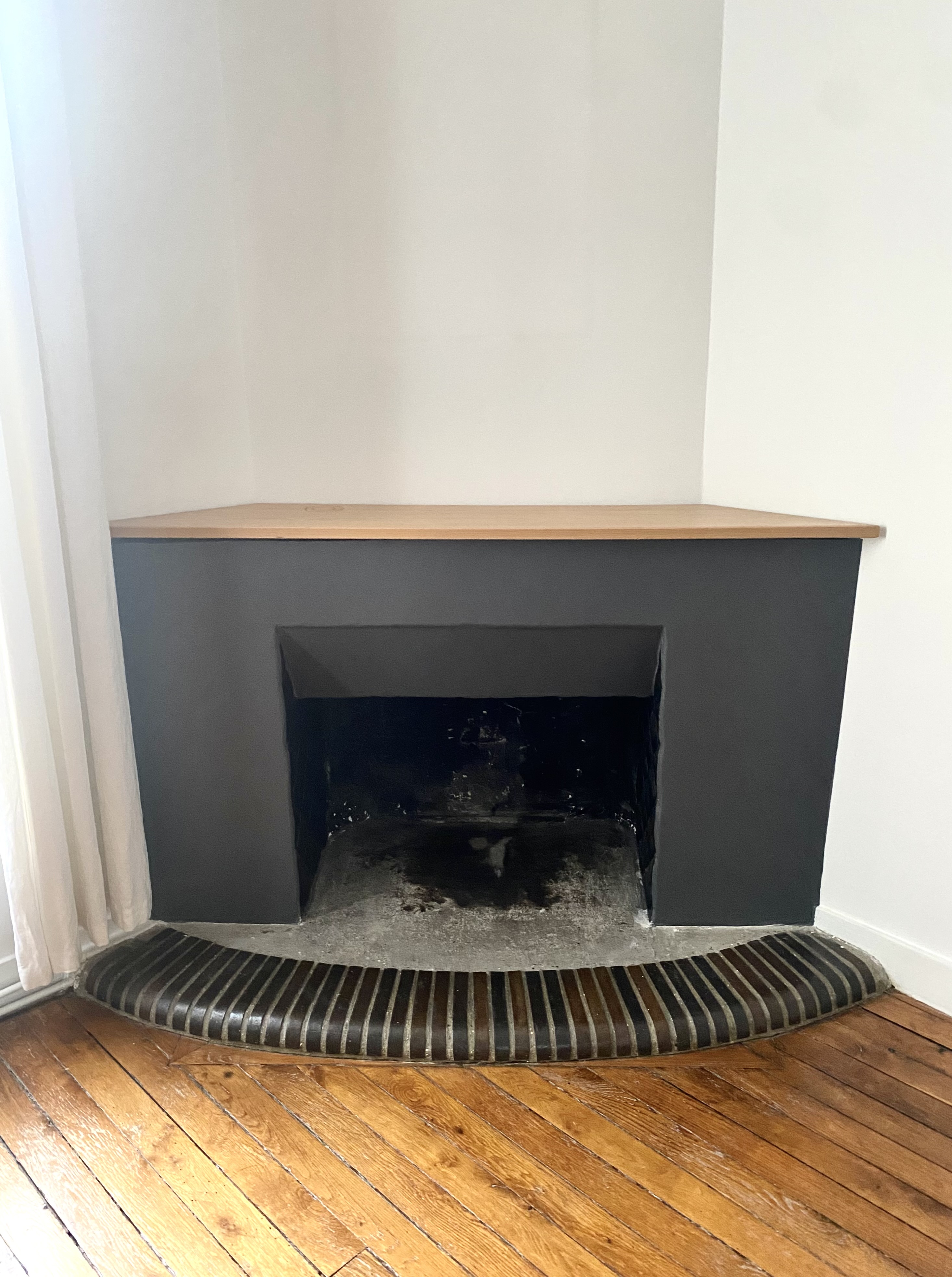 Nous avons poursuivi avec la mise en place du rétrécis en métal ainsi que de son rideau. L’intérieur a été réalisé en briques réfractaires, et un avaloir sur mesure a été conçu puis raccordé au conduit afin de garantir le bon fonctionnement de l’ensemble. Enfin, une plaque en fonte a été ajoutée au fond de la cheminée, apportant une touche décorative élégante.