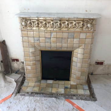 Cette cheminée donc, a été fabriquée dans un marbre blanc carrare. J’ai fait fabriquer un rétrécis en acier noir avec un rideau ancien. De plus l’âtre est en acier fabriqué sur mesure et posé sur une plaque en marbre uni, donnant un accent résolument actuel à cette cheminée qui connaît ainsi une seconde vie.